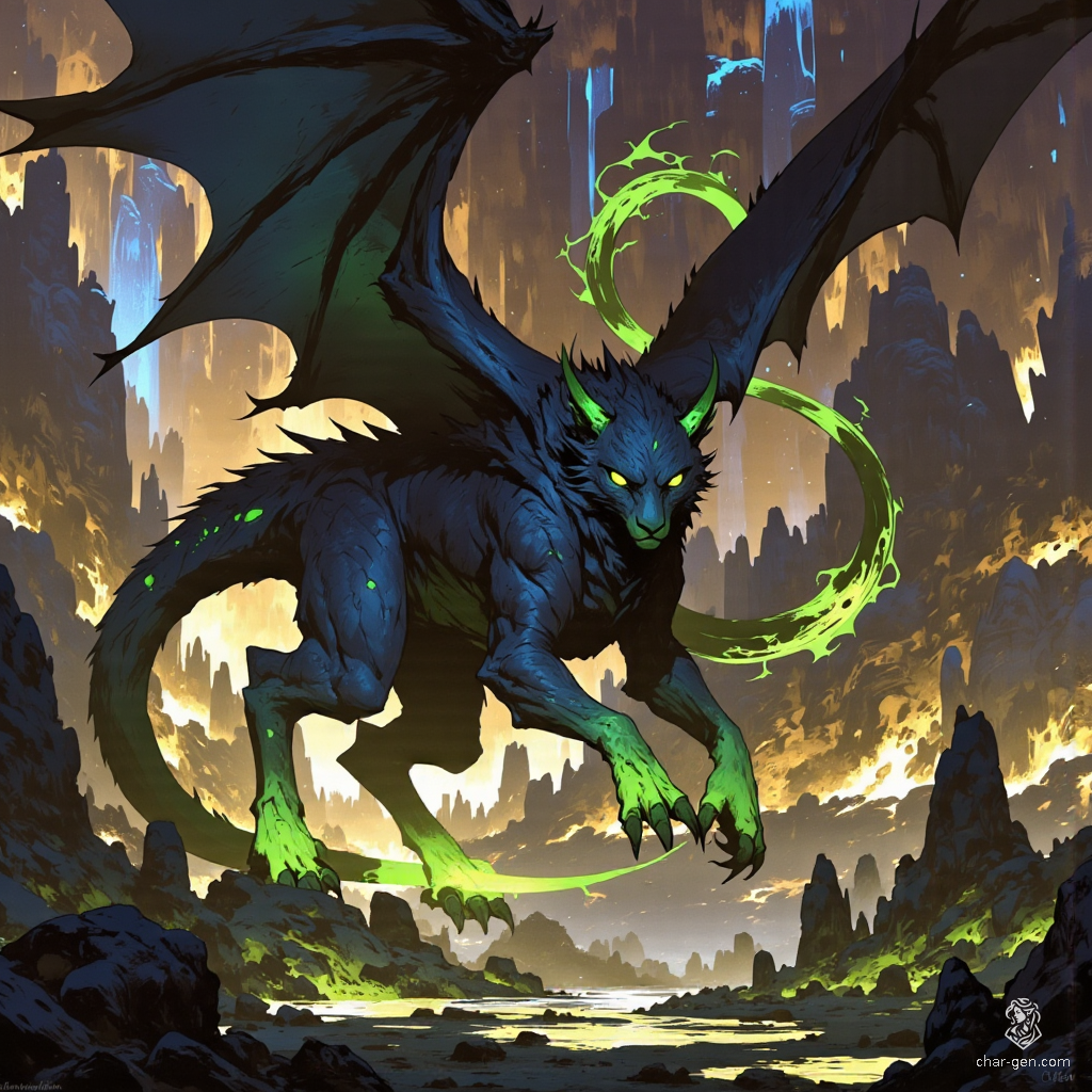 The displacer beast dragon hybrid prowls along the edge of the vast Underdark lake, a sinister fusion of displacer beast and dragon traits. Its panther-like head, large black wings with green tips, and tentacles emitting a blue haze create a striking silhouette. The creature's black scales and acid-dripping claws add to its menacing aura. In the background, the dark, still waters of the underground lake reflect the dim light, beneath a rocky ceiling dotted with stalactites.