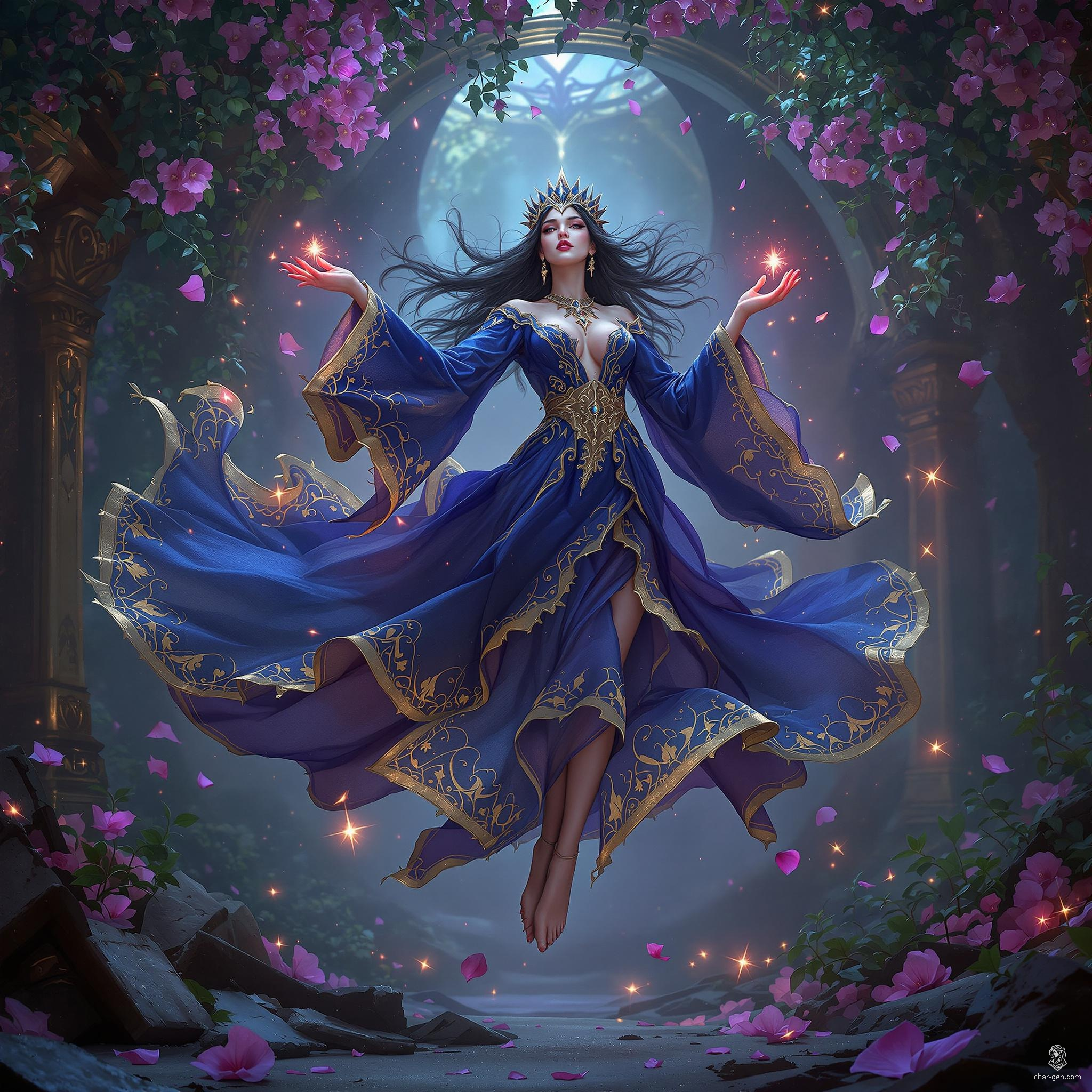 In the midst of a ravaged grand ballroom, a regal, ethereal female figure hovers, exuding a commanding presence. Draped in dark blue and violet robes trimmed with gold and trailing magical energy, her long, dark hair flows behind a silver-blue spiked crown. Her hand, adorned with gold jewelry, raises gracefully against a soft, mystical glow, embodying an otherworldly queenly essence.