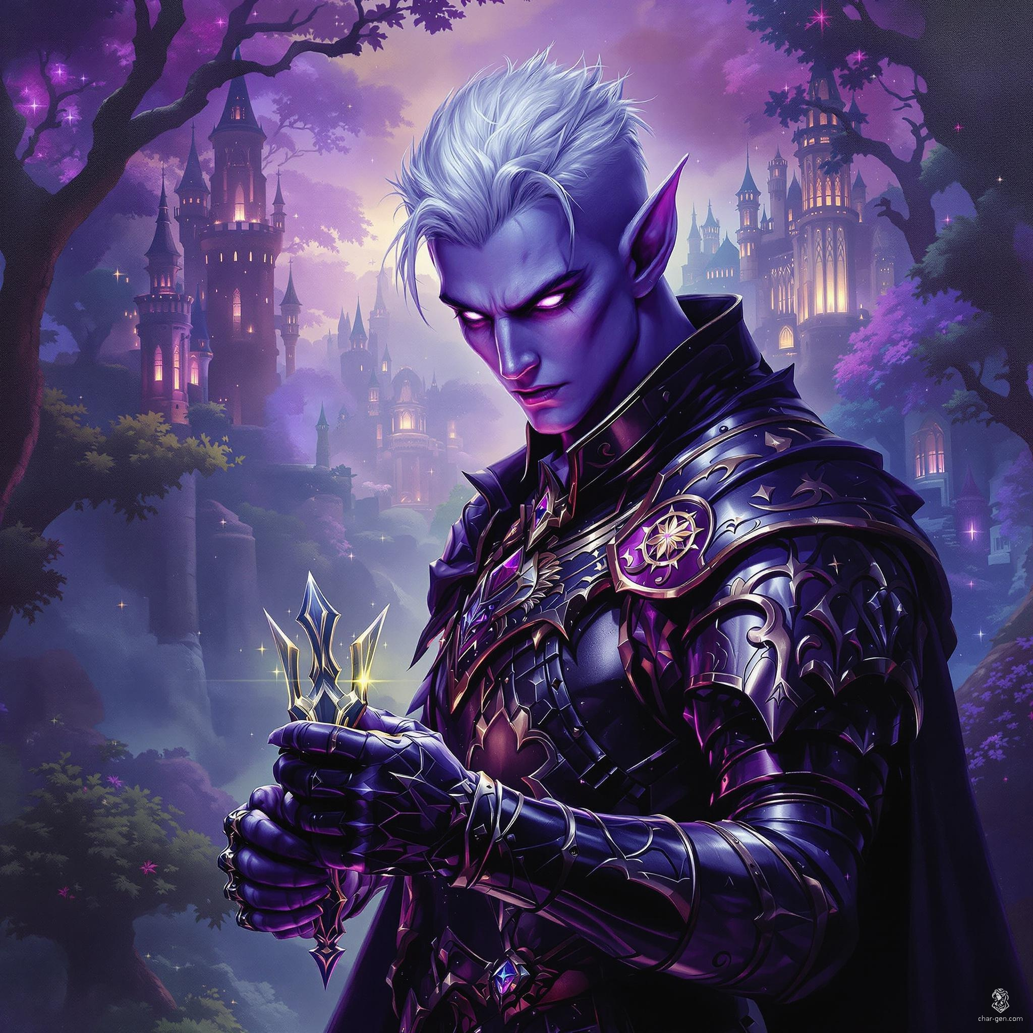 A 86-year-old Drow Bard, this charismatic charlatan wields a lute with expressive gestures, captivating audiences despite his decrepit form. Standing 6'2" with a medium build, his lavender-hued skin and striking royal purple eyes contrast sharply with his white, shaved hair. Always gripping a dagger, he navigates life with wit and charm.