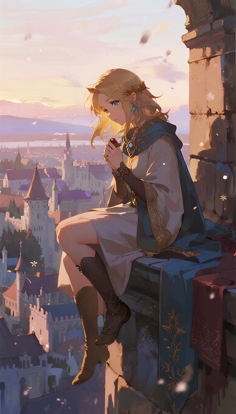 painterly, fantasy illustration, Magic the Gathering style, High Fantasy Anime Art Style, young human cleric of Lathander sitting on a quiet temple rooftop at dawn, legs dangling and holy symbol clasped to her chest, soft breeze ruffling loose golden hair and modest yet flattering sun-embroidered robes, sprawling medieval city below just waking, warm sunrise rim light and floating dust motes, contemplative hopeful mood, rosy golds and pale blues with soft lavender shadows, high-detail digital painting, gentle textured brushwork