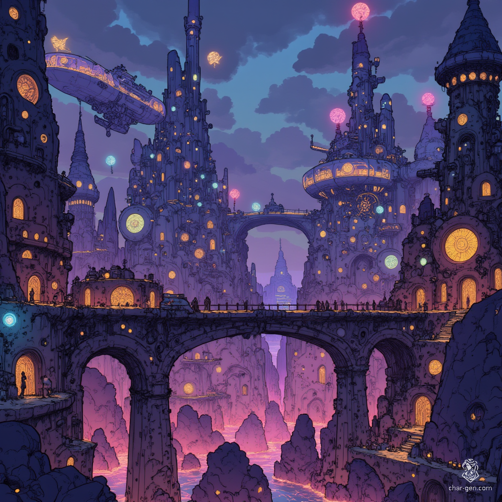 The City of Towers, Sharn, rises majestically with its hundreds of towering spires connected by intricate bridges. This metropolitan marvel presents a vivid tableau of dynamic contrasts, where bold colors illuminate the city in stylized noir fashion. Floating airships drift against a backdrop of bustling steampunk-inspired streets beneath a sky filled with industrial smoke and magical auras.