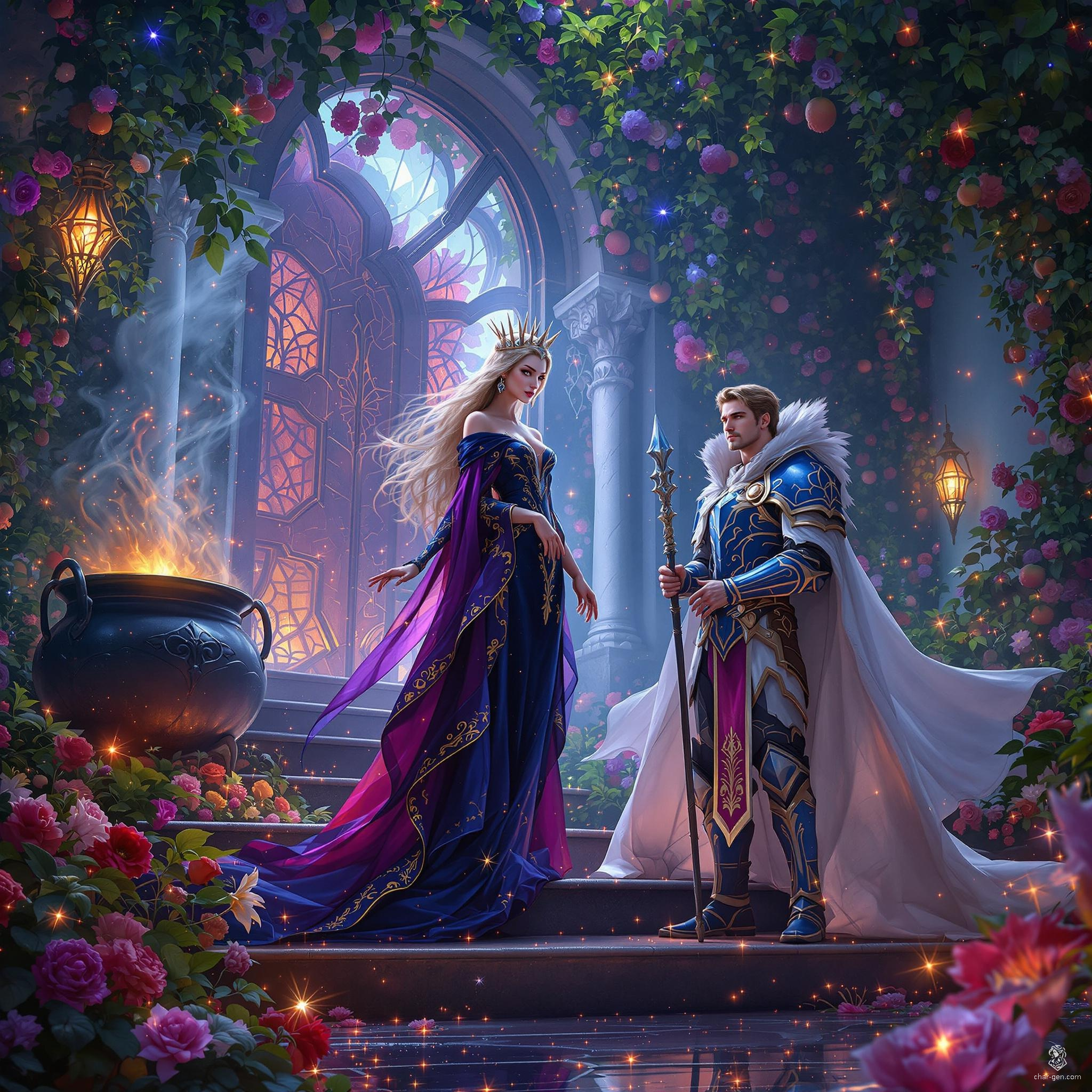 In a grand ballroom, the regal, ethereal enchantress floats midair, adorned in flowing, dark blue and violet robes with gold trim. Her commanding, mystical presence is amplified by a spiked silver-blue crown and glowing red-lined garments. Beside her, a young armored warrior stands poised, holding a fine quarterstaff. Both figures, frozen in desperate motion, reach toward a dark vaporous cauldron atop a central dais.