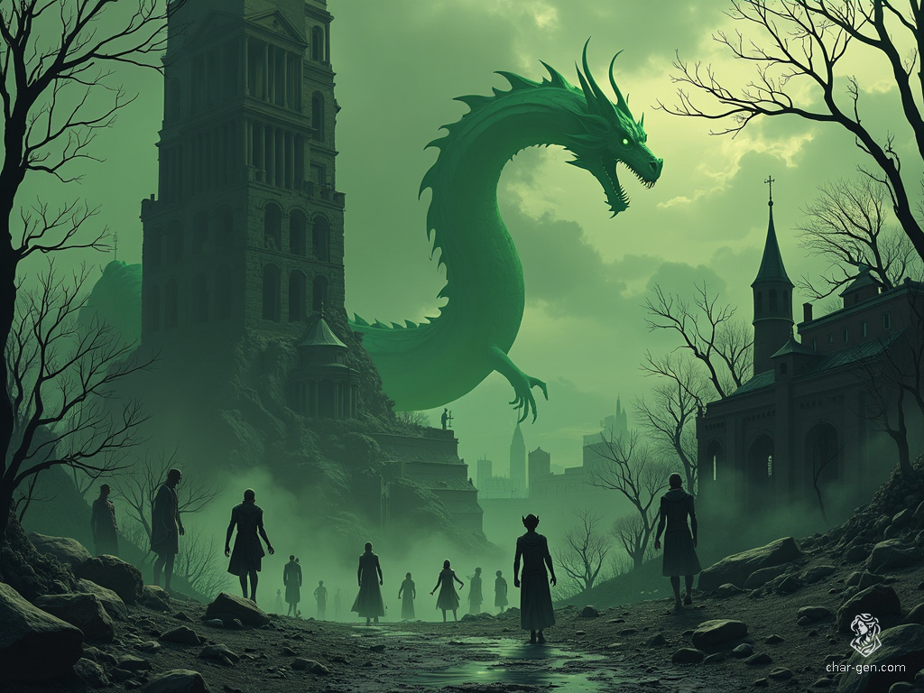 A hauntingly beautiful landscape, once a thriving village, now echoes with the eerie presence of ash zombies. Scorched trees and crumbling buildings encircle the dominating ruins of a tower, home to a fearsome green dragon.
