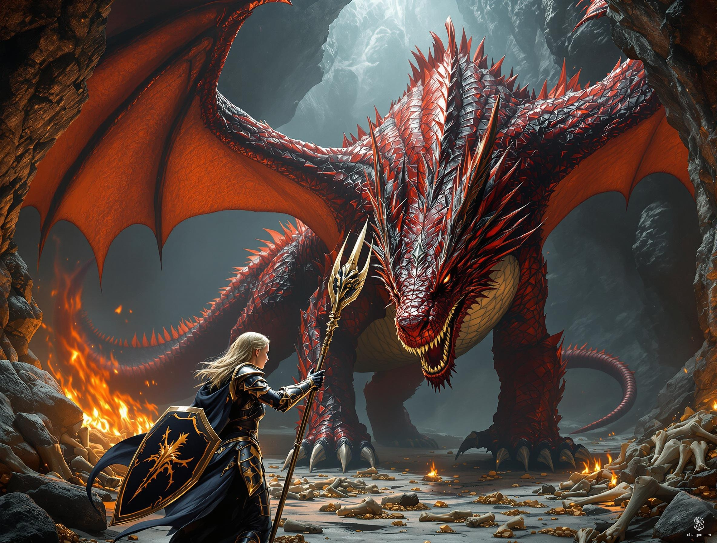 An elven knight with golden hair and delicate features stands resolute in ornate steel and gold plate armor. Her enchanted three-pointed shield blocks a blazing red dragon’s fiery breath, while her lance, adorned with a dragon’s head, strikes fiercely against the enormous, copper-scaled beast.