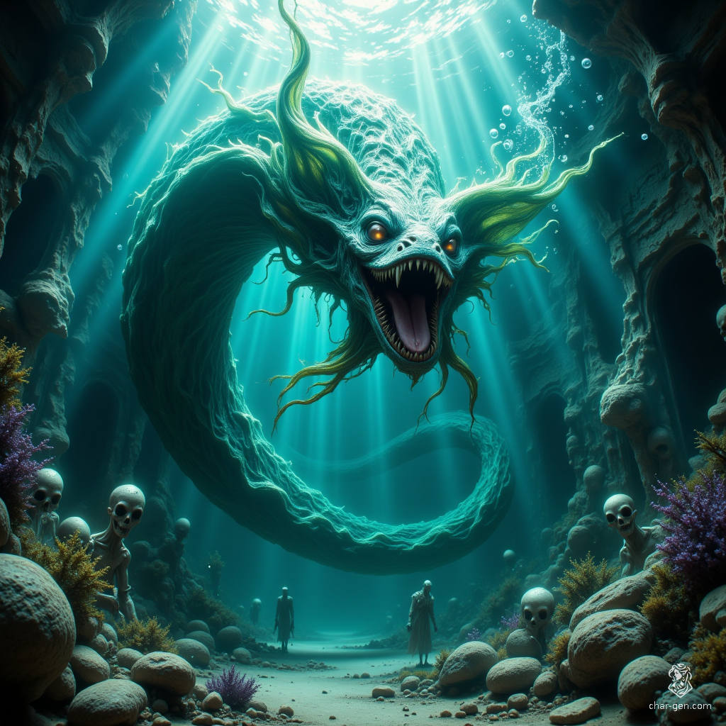 This colossal aboleth, with translucent cyan veiny skin and menacing spikes atop its head, commands the dark underwater realm. Its gaping mouth and fierce eyes exude power, surrounded by the remnants of its violent past. Bubbles drift in a ghastly ambiance, highlighting its ancient, serpentine form.