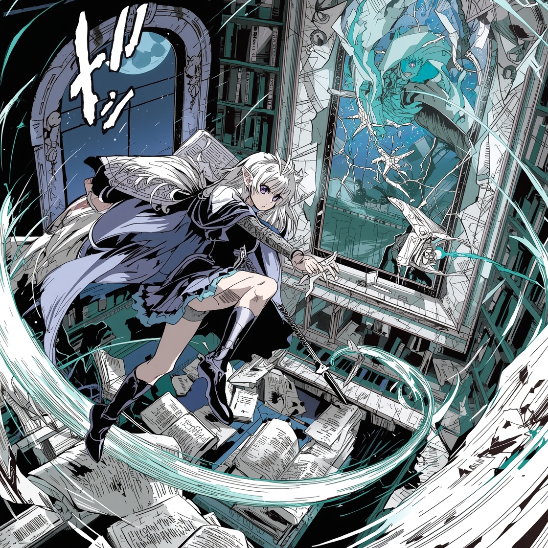 crisp manga art, silver-haired elven bladesinger, mid-spin on a crumbling library balcony slashing through a ghostly beholder, torn spellbooks and ink pages swirling like shuriken, distant city lights through shattered stained glass, moonlight streaming in strong diagonal beams, dynamic speed lines and motion blur on cloak and blades, tense and heroic mood with hint of melancholy, cool blues and violets contrasted with streaks of neon teal spellfire, ultra-clean inked linework with screentone shading and sharp highlights, high-detail splash-page composition
