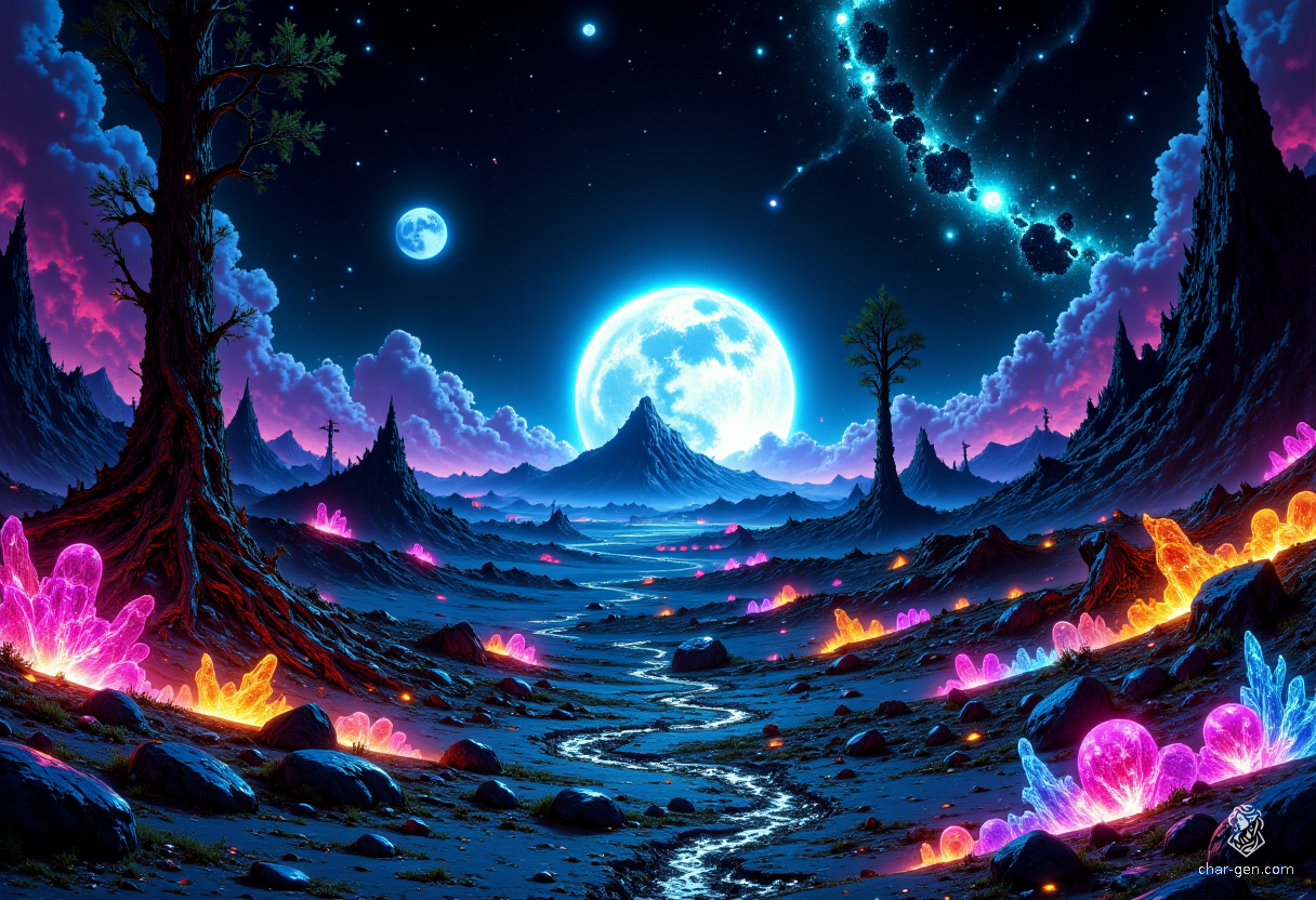 A desolate planet bathed in the eerie glow of an alien moon, surrounded by swirling nebulae. Twisted flora sprouts from cracked soil, while the remnants of ancient ruins peek through a hazy mist. Distant moons shimmer in a clear black sky, hinting at forgotten mysteries.