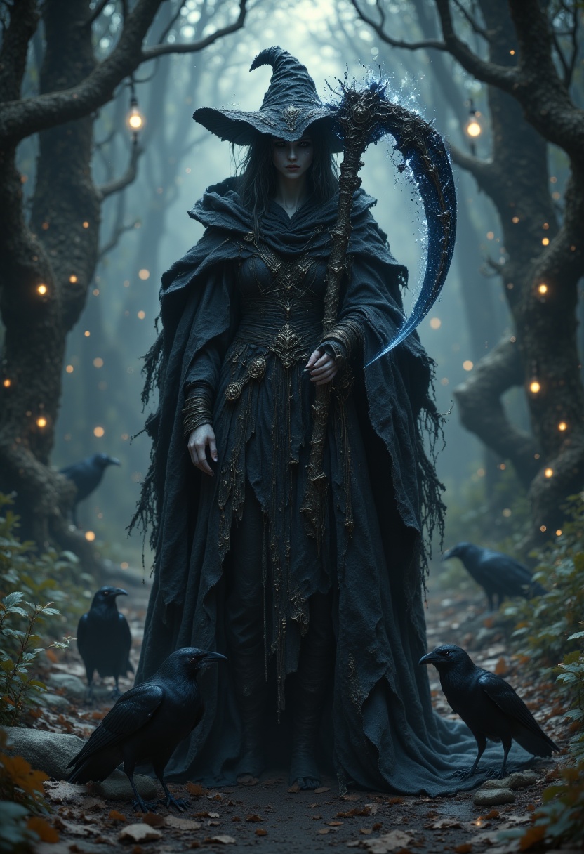 Highly Detailed. High Definition. Photorealistic. Branwen Umbra stands about 5'6" tall, is of slender build and appears to be in her late teens. Her skin is alabaster white and shimmers like moonlight on a lake. Her hair is as black as onyx and writhes as if made of smoke. Her eyes are pupilless and look like swirling pools of silver and black. She wears a large, black wizards hat. Her clothes are a mixture of leathers, silks, hempen cloth and feathers. Some new, some patched together, but all black in colour. She is barefooted, carries a scythe and is accompanied by a pair of ravens. 8K ultra-realistic cinematic still, advanced material shaders, dynamic particle effects, HDRI lighting 8K ultra-realistic cinematic full body shot, volumetric light beams, dynamic particle effects, advanced skin shaders.