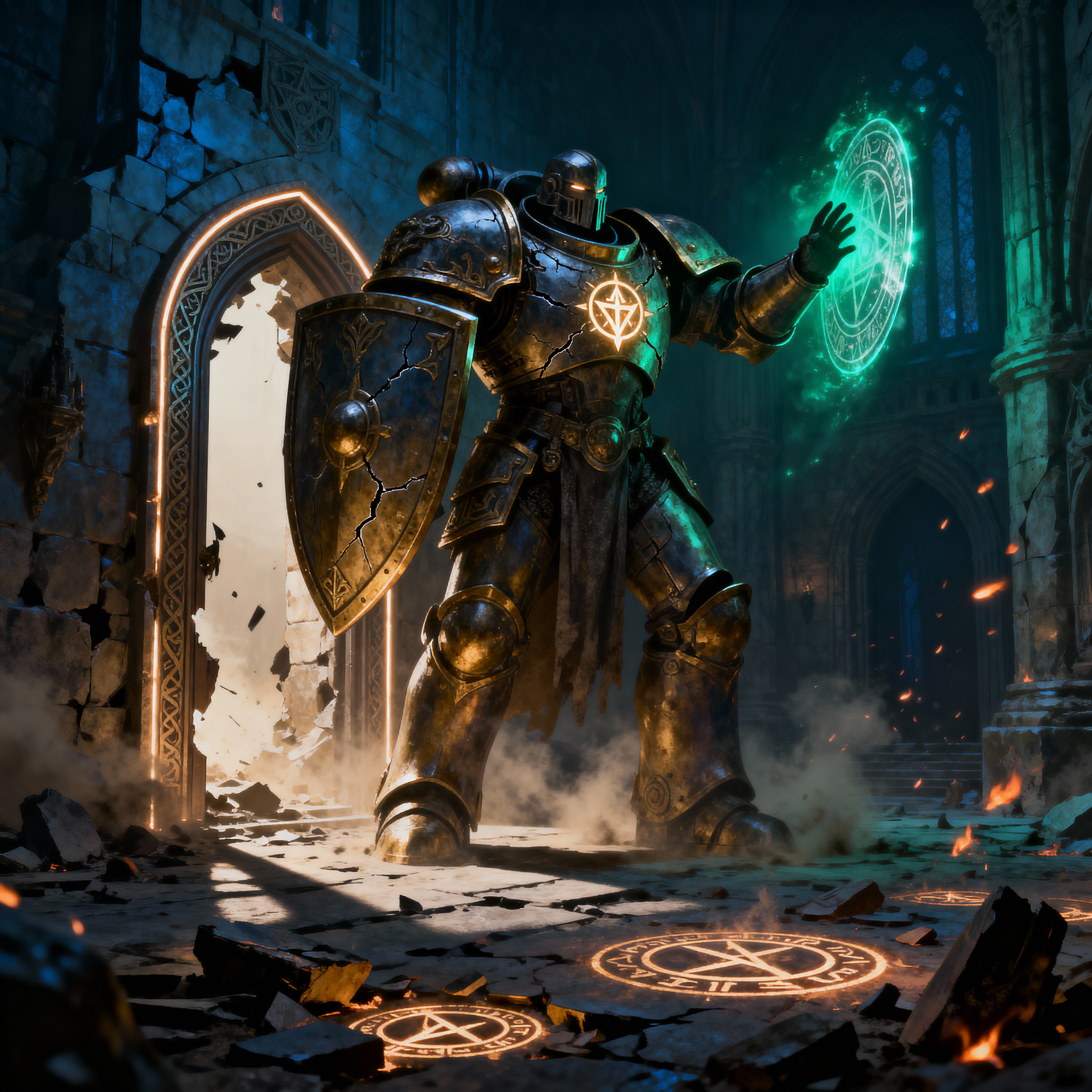 dark fantasy illustration, towering shield guardian construct, broad-shouldered and looming in a protective stance with one arm raised to conjure a shimmering force barrier, crumbling stone hall of an ancient wizard’s tower with shattered runes glowing underfoot, dramatic backlighting from a blown-out doorway casting long shadows and metallic rim light along engraved plates, atmosphere thick with dust motes and drifting embers, mood of unstoppable vigilance and implacable power, palette of cold steel blues and muted brass with sharp accents of emerald arcane light, ultra-detailed digital painting with engraved armor textures, hairline cracks, and glowing sigil in its chest core