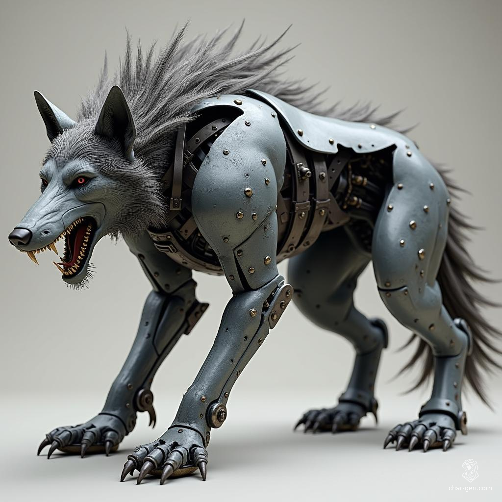 The mechanical dire wolf is a formidable creature crafted from sleek grey metal, exuding an aura of menace. With sharp, angular features and glowing eyes, it stalks its prey silently, a relentless fusion of beastly power and advanced machinery, embodying the perfect predator in a metallic form.