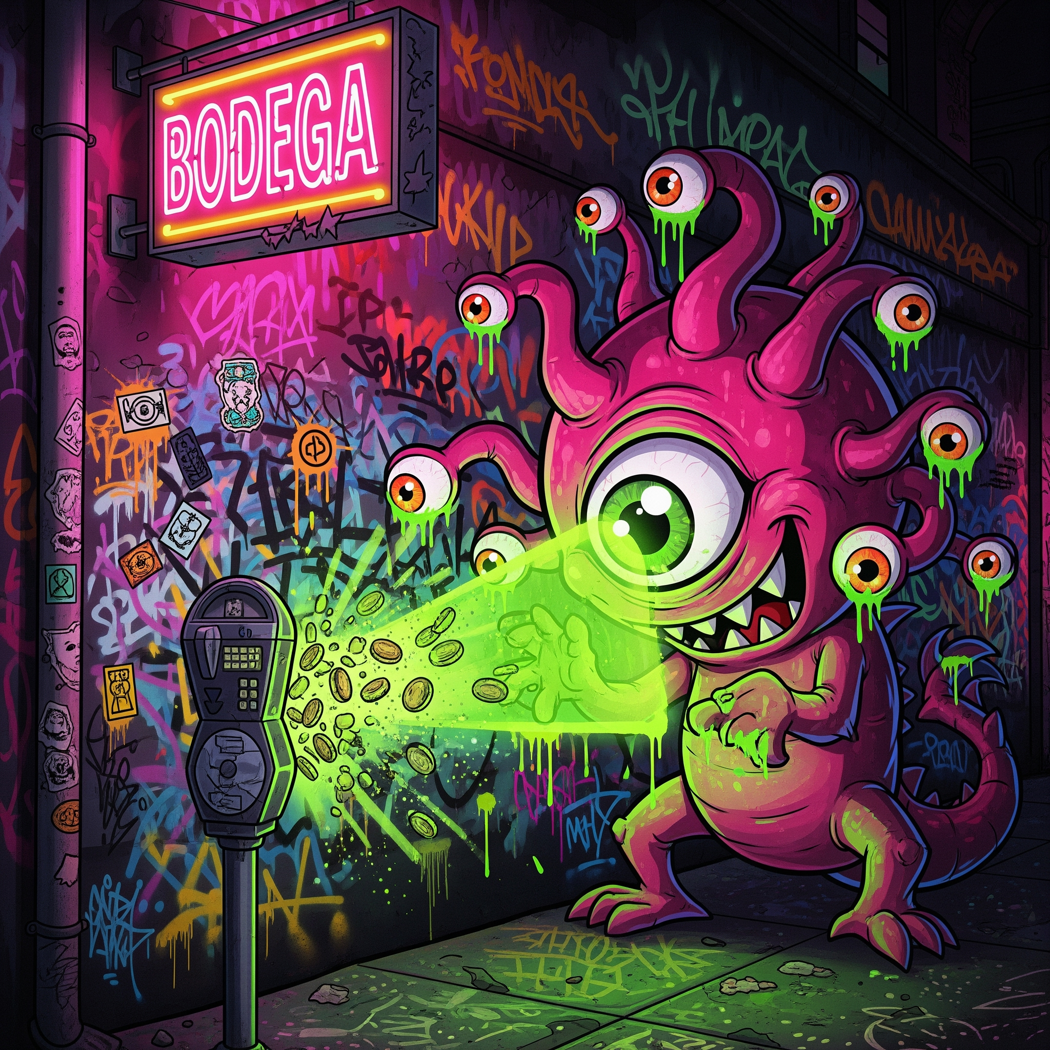 neon-lit graffiti mural style, chibi beholder casting Disintegrate at a parking meter, urban alley with dripping tags and sticker-bombed arcane sigils, glowing lime beam carving coins into glittering dust, backlit by a flickering bodega sign, cheeky and chaotic mood, hot pinks and toxic greens with midnight blues, spray paint and paint-marker illustration, bold outlines and drippy textures