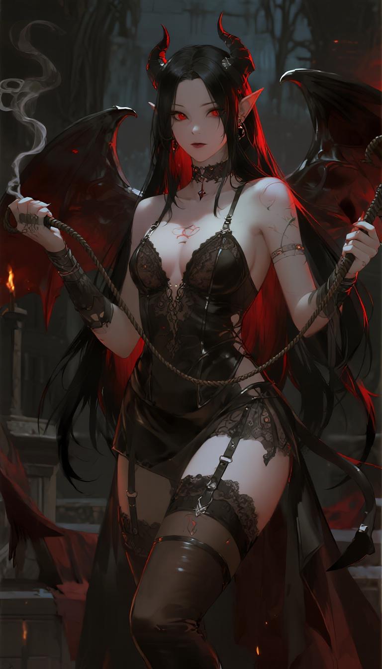A cinematic, realistic-anime succubus warlock: lithe, long black hair tipped crimson, bat wings unfurled, thigh-high leather boots and harness over sheer lace. Glowing runes crawl across exposed skin as she wields a whip of fire and shadow amid smoky red rim light.