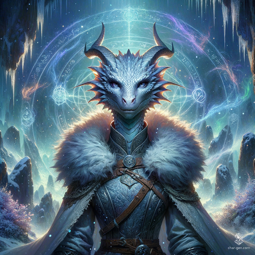 A silver-skinned female dragonborn sorcerer stands poised in a snowy mountaintop cave, cloaked in warm fur and arcane-etched garments. Surrounded by translucent ice mephits and a psychic magical aura, her frosted scales shimmer amid the cold, mystical energy of the icy, dramatic landscape.