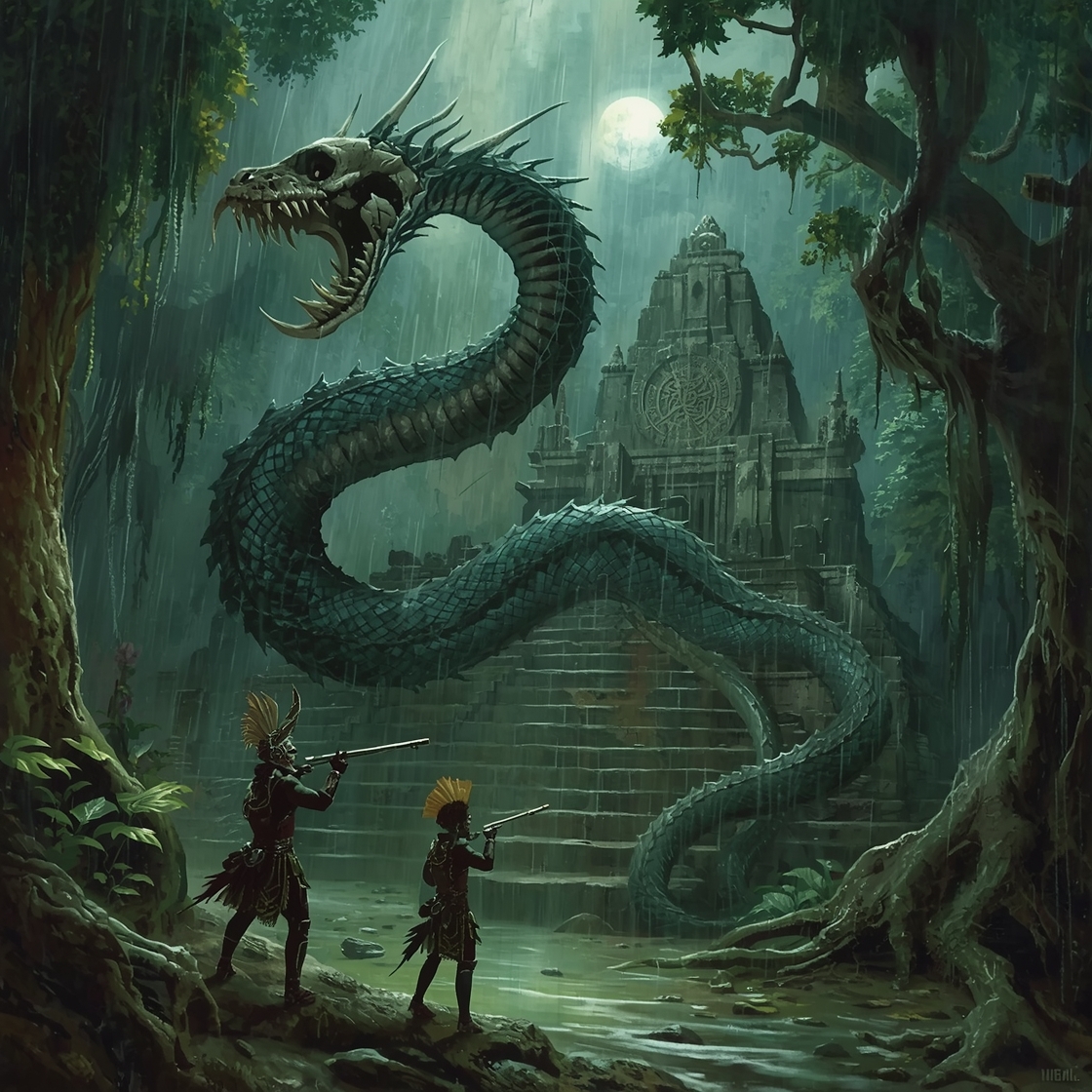 oil-painted dark fantasy, undead bone naga coiled and rearing to strike, hood bones flared and fangs dripping ectoplasm, ruined Chultan ziggurat with stepped limestone terraces and serpent glyphs, jungle overgrown with strangler figs and kapok roots, two yuan-ti sentries in jade-scaled lamellar and feathered headdresses aiming blowguns, monsoon rain and ground mist, moonbeams slicing through canopy and phosphorescent fungi underglow, ominous and predatory, palette of jade, obsidian, bone-white, and sickly viridian highlights, high-detail brushwork with textured impasto and fine scale etching, cinematic depth and subtle grain