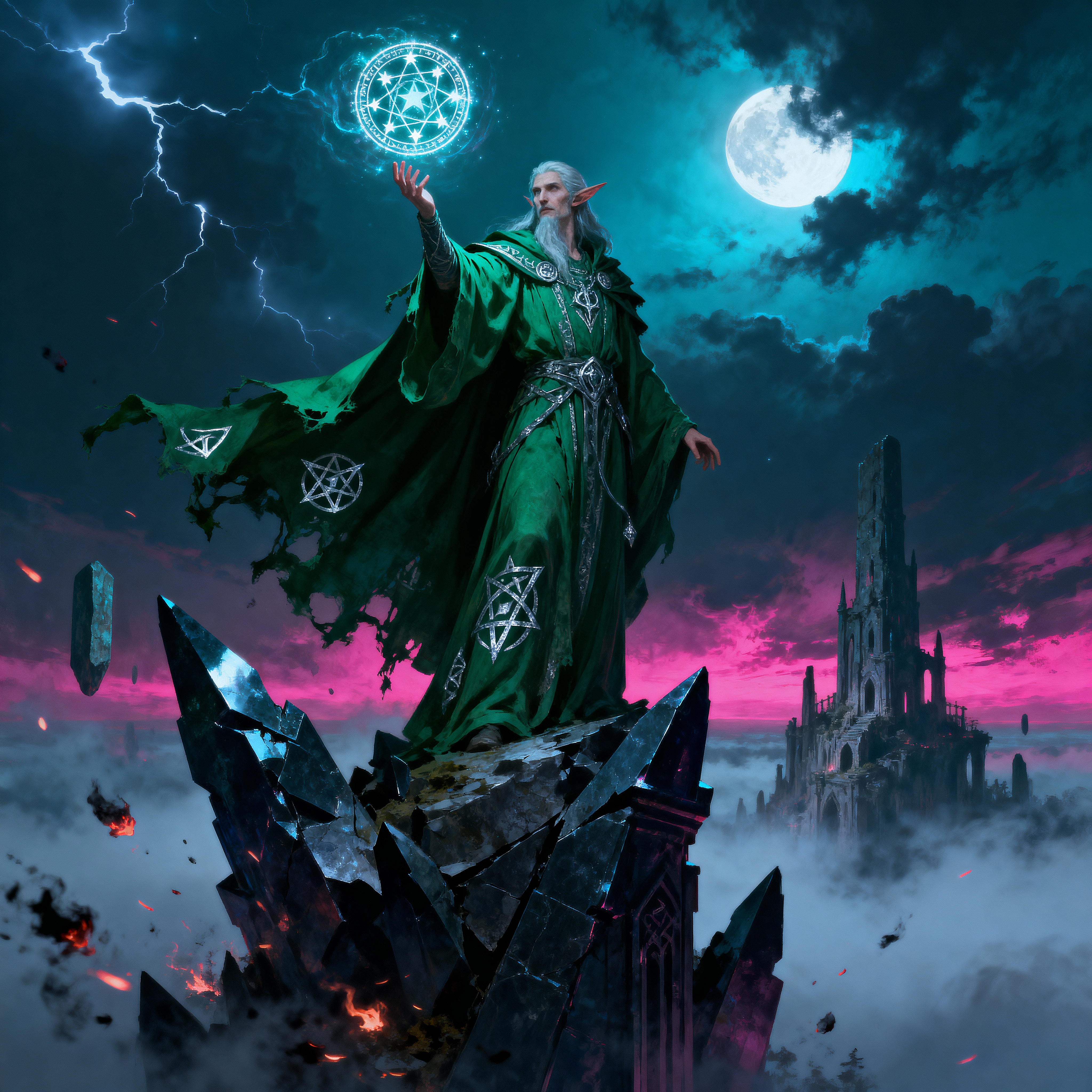 painterly dark fantasy illustration, ancient elven archmage NPC standing atop a broken obsidian spire, one hand raised commanding a swirling ring of runes and starlight, tattered emerald robes etched with silver sigils, moonlit ruined city sinking into mist below, distant floating monoliths, sharp rim light from a crack in storm clouds above, drifting arcane embers and falling ash, solemn and intimidating mood of cosmic authority, deep teal and emerald contrasted with violent magenta and cold moon-blue, ultra-detailed fabrics and stone textures, subtle chromatic aberration, high-resolution digital painting realism