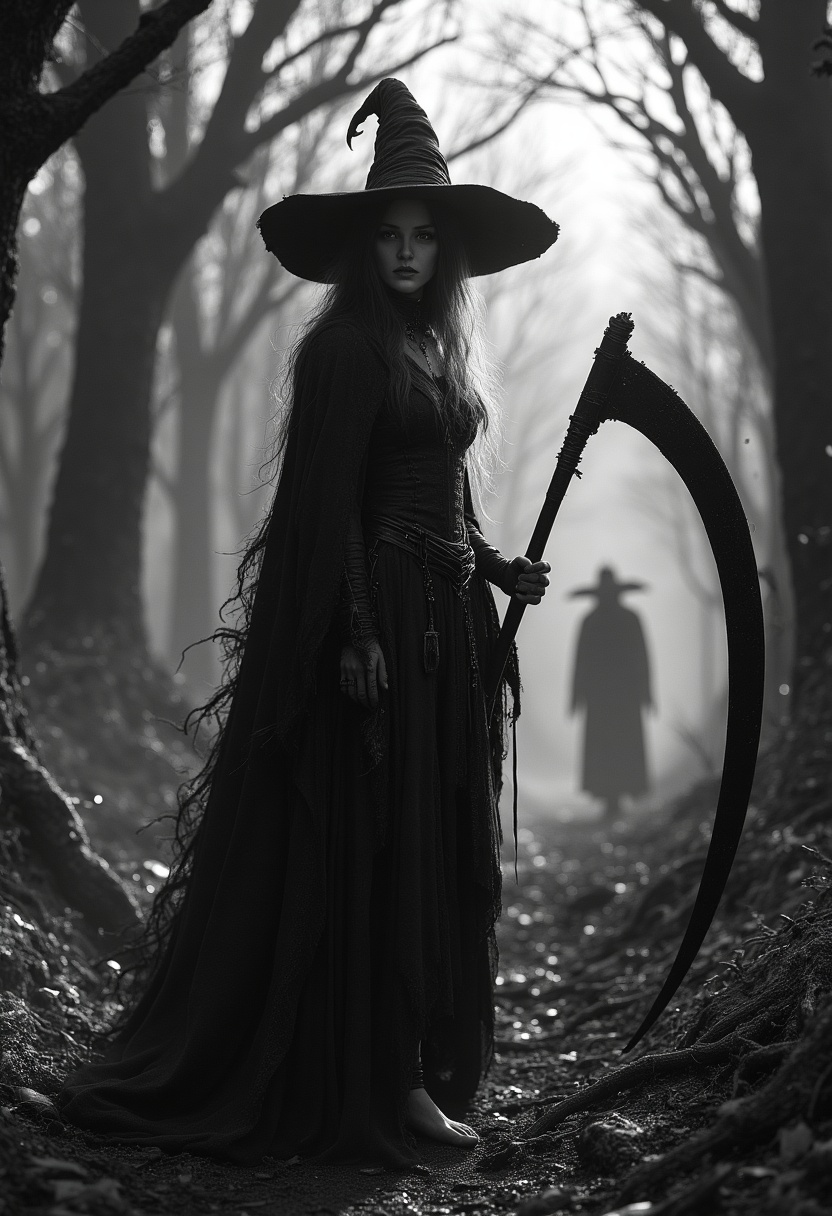 Branwen Umbra, an ancient Umbral Human cleric and sorcerer, wields divine and arcane powers with serene resolve. With shimmering alabaster skin, swirling silver-black eyes, and onyx-black writhing hair hidden beneath a dark wizard’s hat, she roams with a scythe and raven familiars, offering aid to those at their journey’s end.