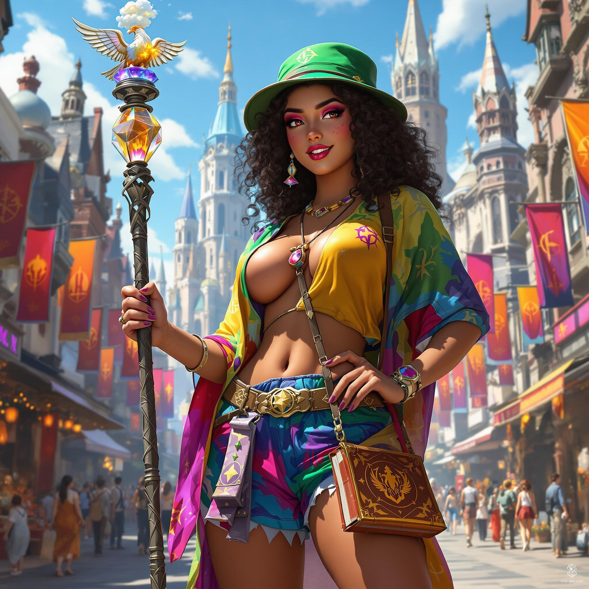 Indra Dwendalia Addams is an 18-year-old wizard adorned in vibrant, loose garments and a quirky green bucket hat. With curly black hair, pink eyeshadow, and a playful demeanor, she wields a staff topped with a cloudy crystal and carries a gilded spellbook. An iron flask and eagle-shaped whistle complete her eclectic ensemble.