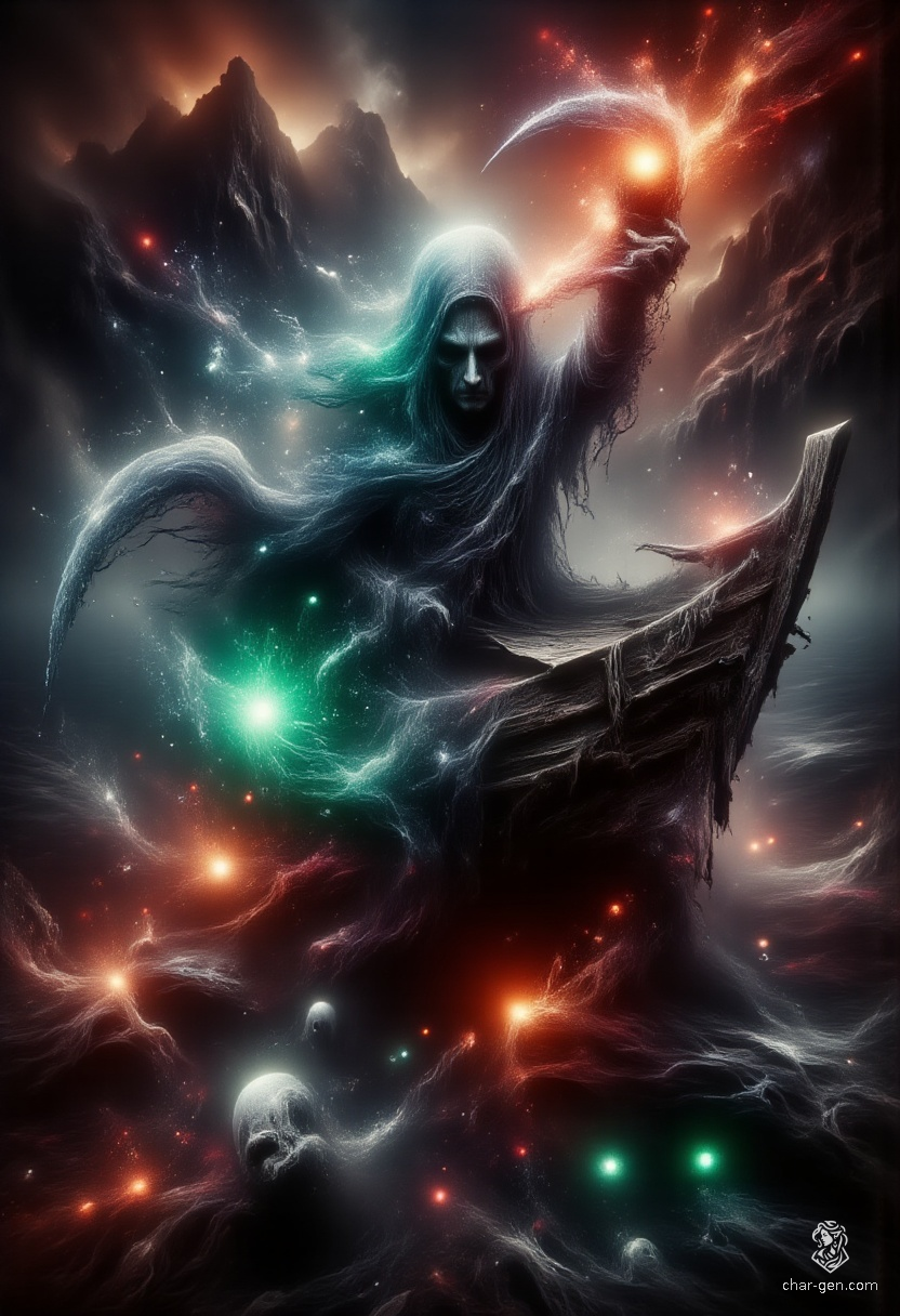 Amidst a blood-red sea, an ancient crone stands on a decrepit boat, her haggard form illuminated by a flickering lantern. Wrinkles map her face, and arcane sigils swirl around her, hinting at her warlock powers. Shadows of lost souls rise from the depths, drawn to her eerie aura.