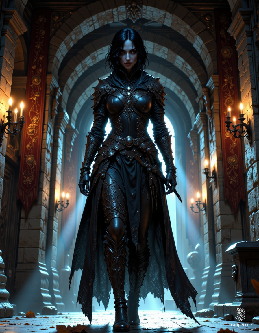 In the depths of a shadowy castle, a young female assassin glides effortlessly through the night. Her jet-black bob frames a pale face, accentuated by form-fitting leather armor that highlights her curvy figure. With daggers hidden expertly on her person, she embodies both beauty and danger.