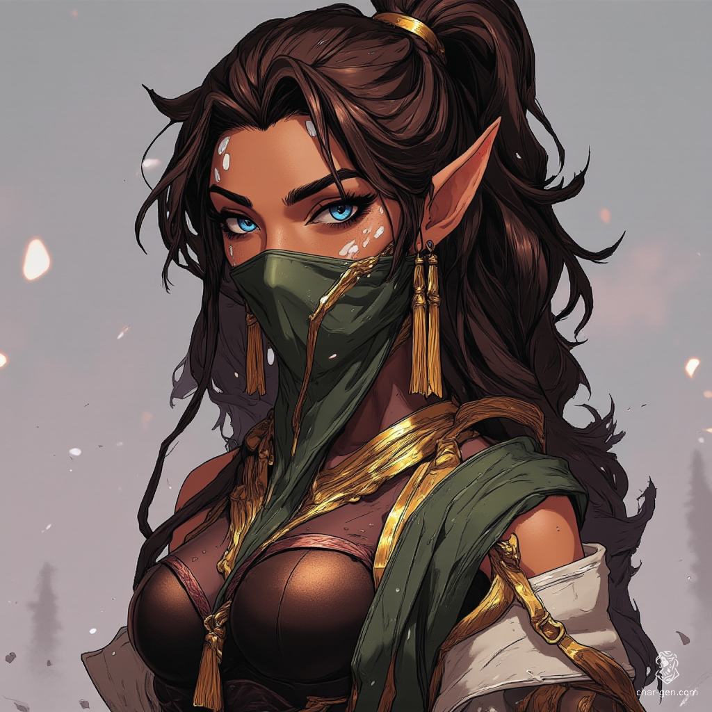A strikingly attractive middle-aged elf, she possesses captivating blue eyes and a high-structured dark brown ponytail adorned with gold. Delicate white body patterns grace her slender form. Dressed in a simple black Egyptian cloth dress, her tired expression is partially concealed by a flowing green silk veil, accented with long gold earrings and a necklace.