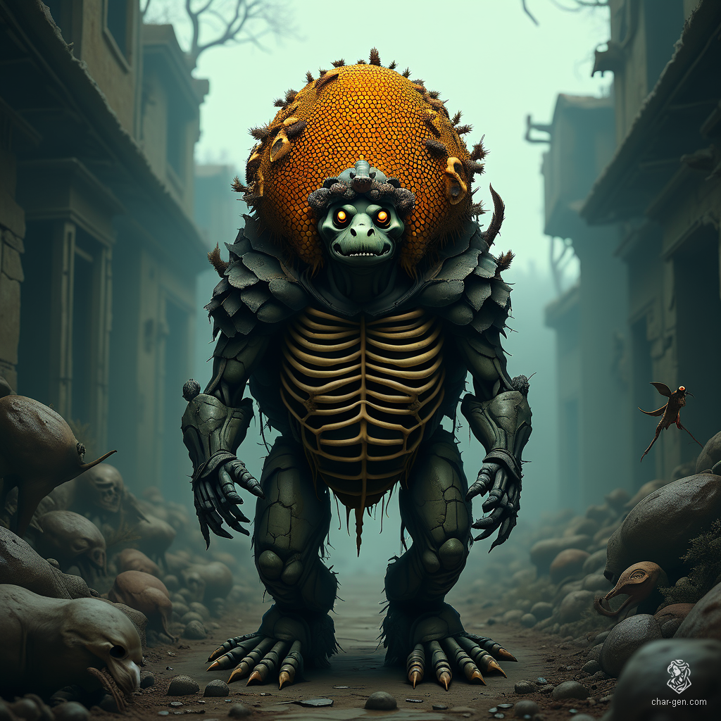Meet the Undead Druid Tortle, a skeletal entity with a sturdy, hive-covered shell teeming with honeycomb. This anthropomorphic turtle commands nature and its creatures, aided by swarms of bees and the whispers of the forgotten, embodying both decay and rebirth in a realm of earthy magic.
