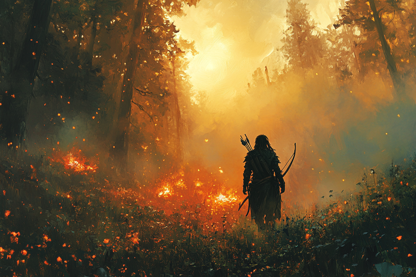 painterly, fantasy illustration, Magic the Gathering style, High Fantasy Anime Art Style, bronze dragonborn ranger tracking with bow half-drawn, dew-soaked dawn forest of towering redwoods and drifting pollen, lancing godray beams through mist with soft ember motes from a smoldering camp, vigilant and primal resolve, palette of verdigris, burnished bronze, sunrise apricot, and deep forest teal, lush oil-and-gouache brushwork with sharp ink edges, card-art fidelity --ar 3:2 --stylize 500 --chaos 10