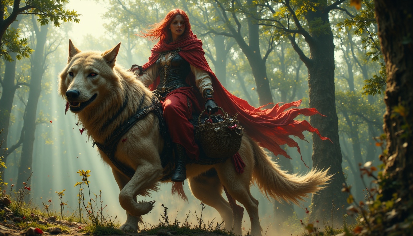 Red Riding hood as a witch killer, riding a Direwolf, carrying a wicker basket of bloody weapons all bloody and red, a long red riding cloak pulled up to crown her face, fiery red hair cascades down her shoulders, she wears a red and white corset synched at the waist, she is in a forest glade, sunlight beams catch at her through gaps in the canopy above, the direwolf stands atop a hillock, it's four legs bloodied but it's fur is pristine, she has blood splatter on her hands and beautiful face, red lips and makeup,