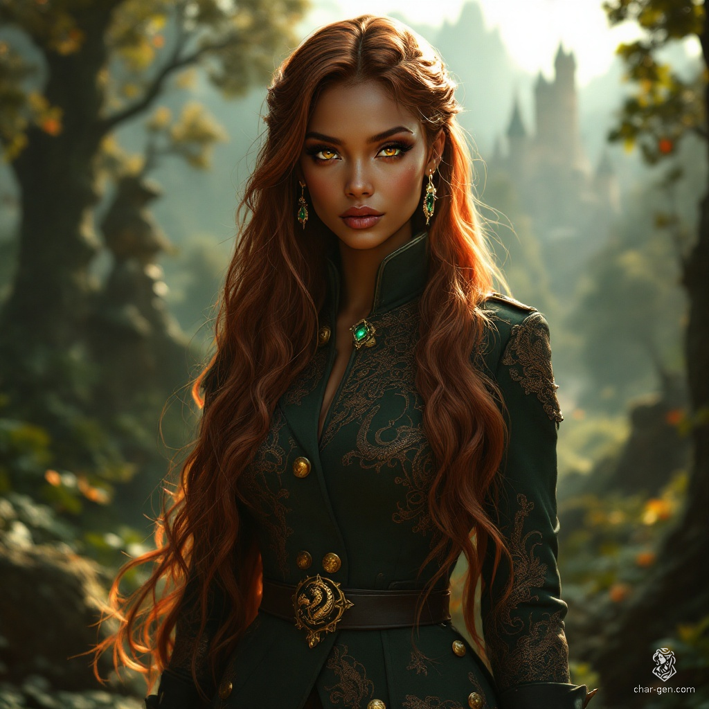 Satyana Vorvexis, a striking 6-foot leader of New Haxon, embodies elegance and authority. With warm bronze skin, flowing copper hair, and piercing copper-green eyes, she captivates all around her. Draped in a military-inspired outfit adorned with dragon motifs, her polished demeanor veils a potent, dangerous essence.