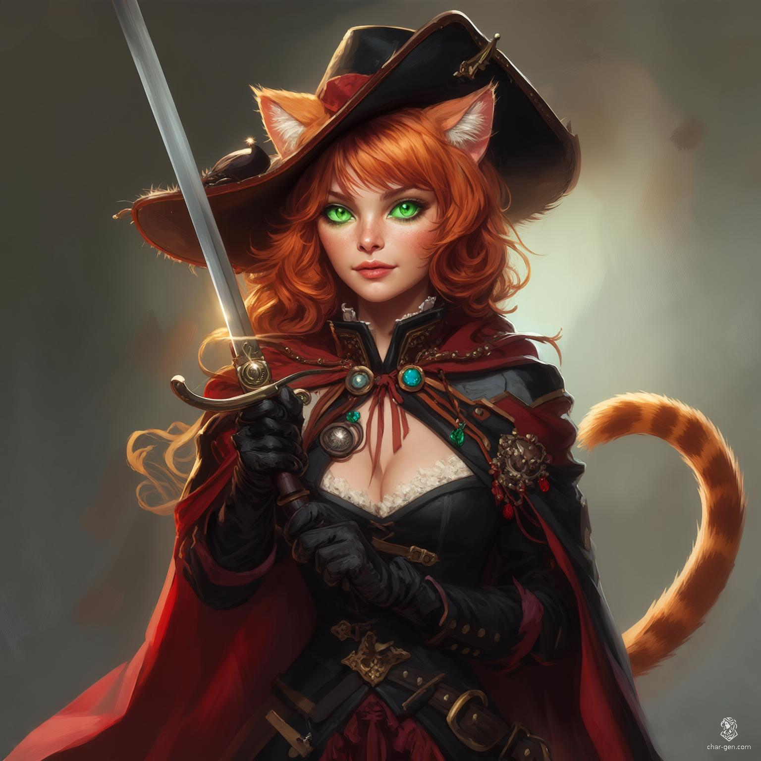 A skilled female duelist bard blending French Renaissance elegance with feline grace. With vibrant ginger hair, green cat-like eyes, and feline features, she wields a rapier confidently, adorned in a cavalier hat and cape. Her dynamic presence radiates charm and deadly precision.