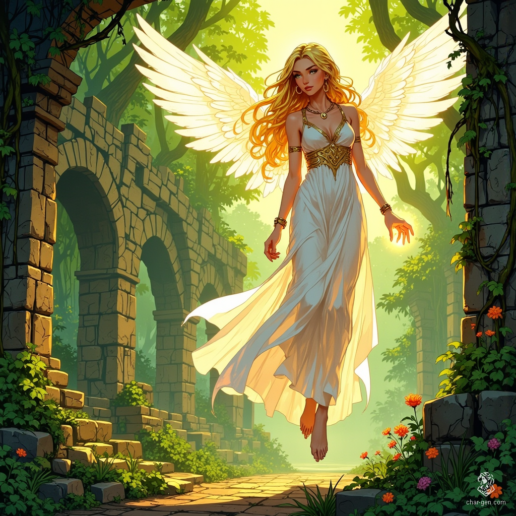 In a breathtaking scene, an angelic female figure gracefully descends over ancient jungle ruins during golden hour. With radiant, feathered wings glowing in soft white and gold, she exudes tranquility. Clad in a flowing white gown, she carries an orb of light, illuminating the overgrown stones and nurturing a sense of hope and wonder.