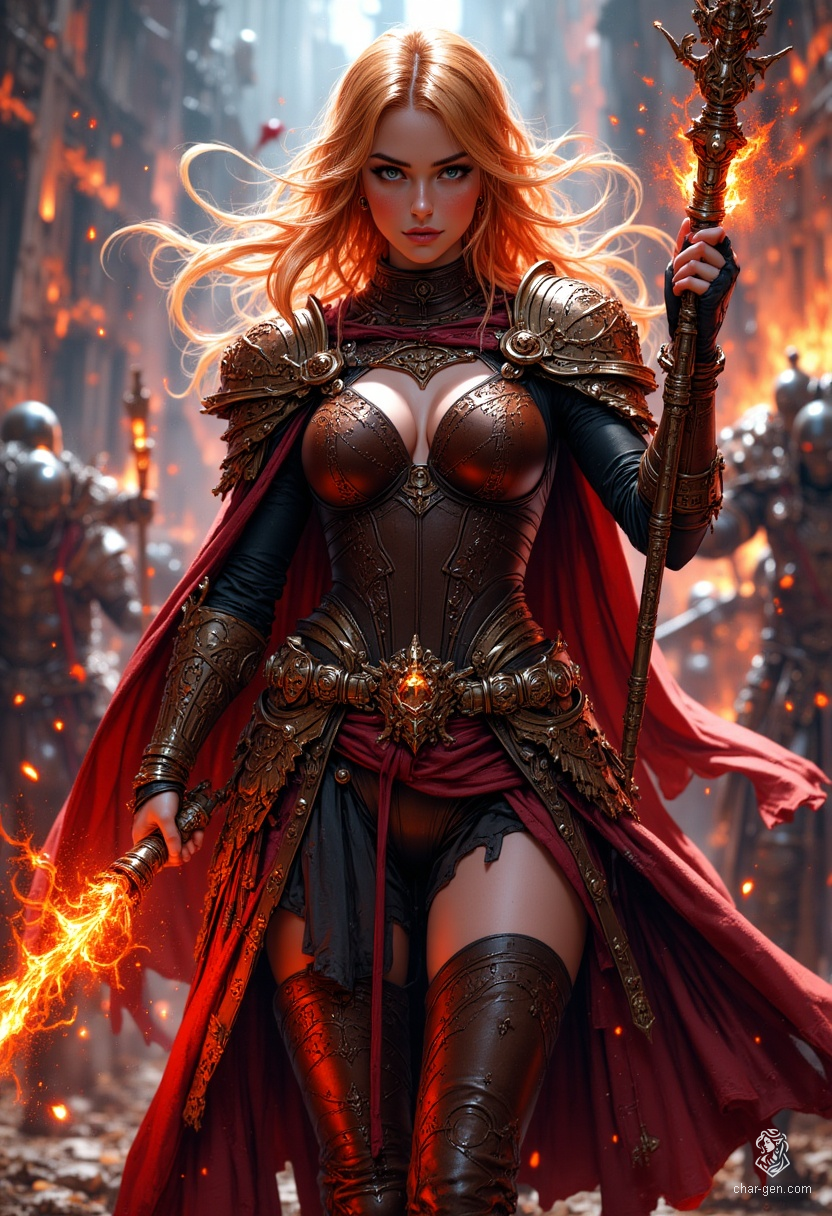 Aleira Emberstorm is a powerful young fire wizard, clad in enchanted leather armor etched with glowing runes and fire symbols. Her flowing orange hair frames a determined, serene face as she wields a magical staff pulsing with red energy, embodying fierce arcane mastery and fiery devotion.