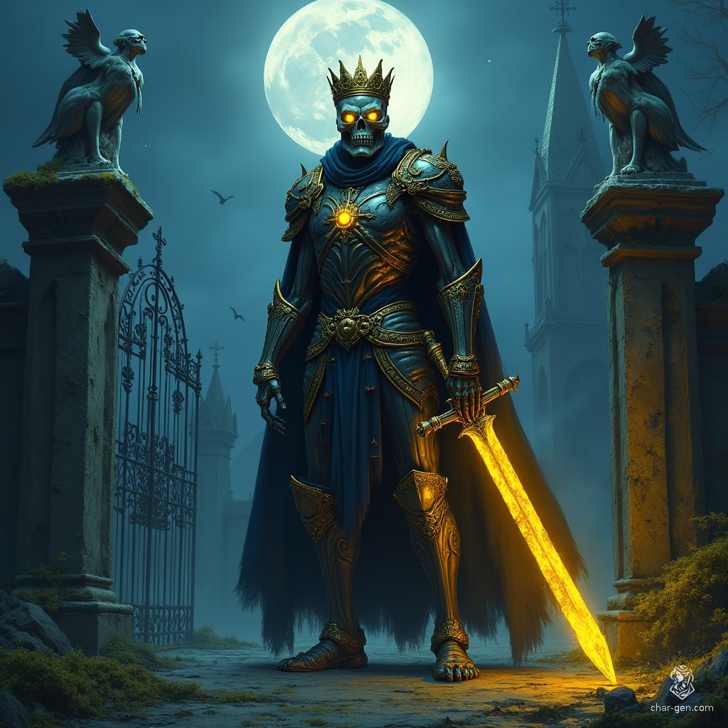 An animated skeleton warrior clad in dark gold cuirass armor and boots, crowned with a golden crown. Its sparkling yellow eyes blaze beneath the moonlight, wielding a bright yellow glowing two-handed broadsword. Set in a dark cemetery, the cinematic scene glows with dim blue light and sharp shadows.