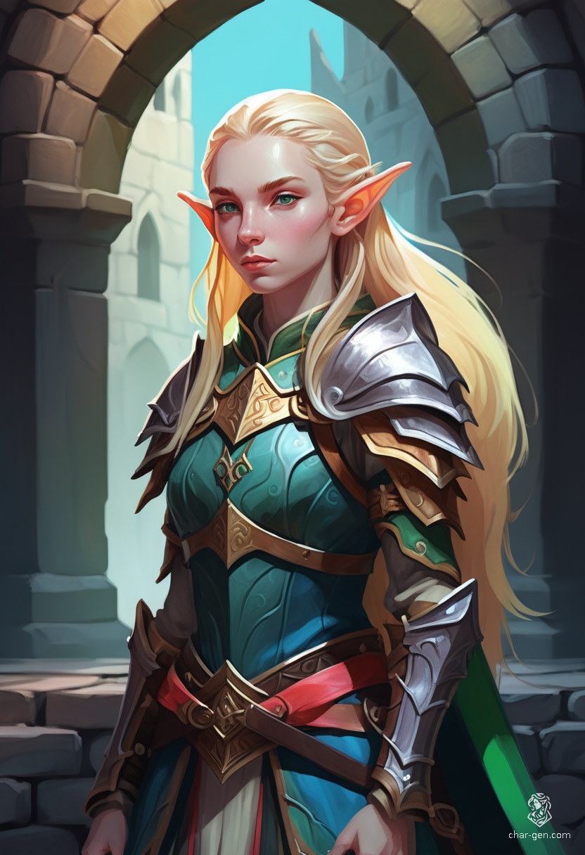 A dignified young elven paladin, her long hair impeccably coiffed, stands poised in vintage pastel armor. With fair, flawless skin and a protective stance, she exudes whimsical nobility—an eccentric guardian framed perfectly in symmetrical, vibrant scenes, straight from a surreal Wes Anderson dreamscape.