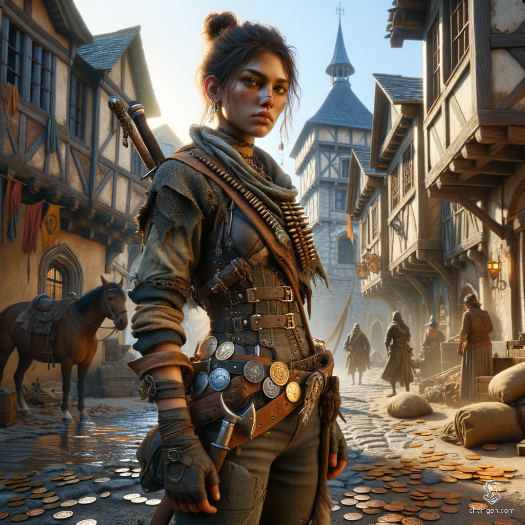 In a medieval village backdrop, an olive-skinned young female fighter stands confidently in tattered leather armor, her dark hair in a bun. A hardened outlaw and bandit, she carries a variety of weapons and a pouch of stolen coins, exuding beauty and danger.