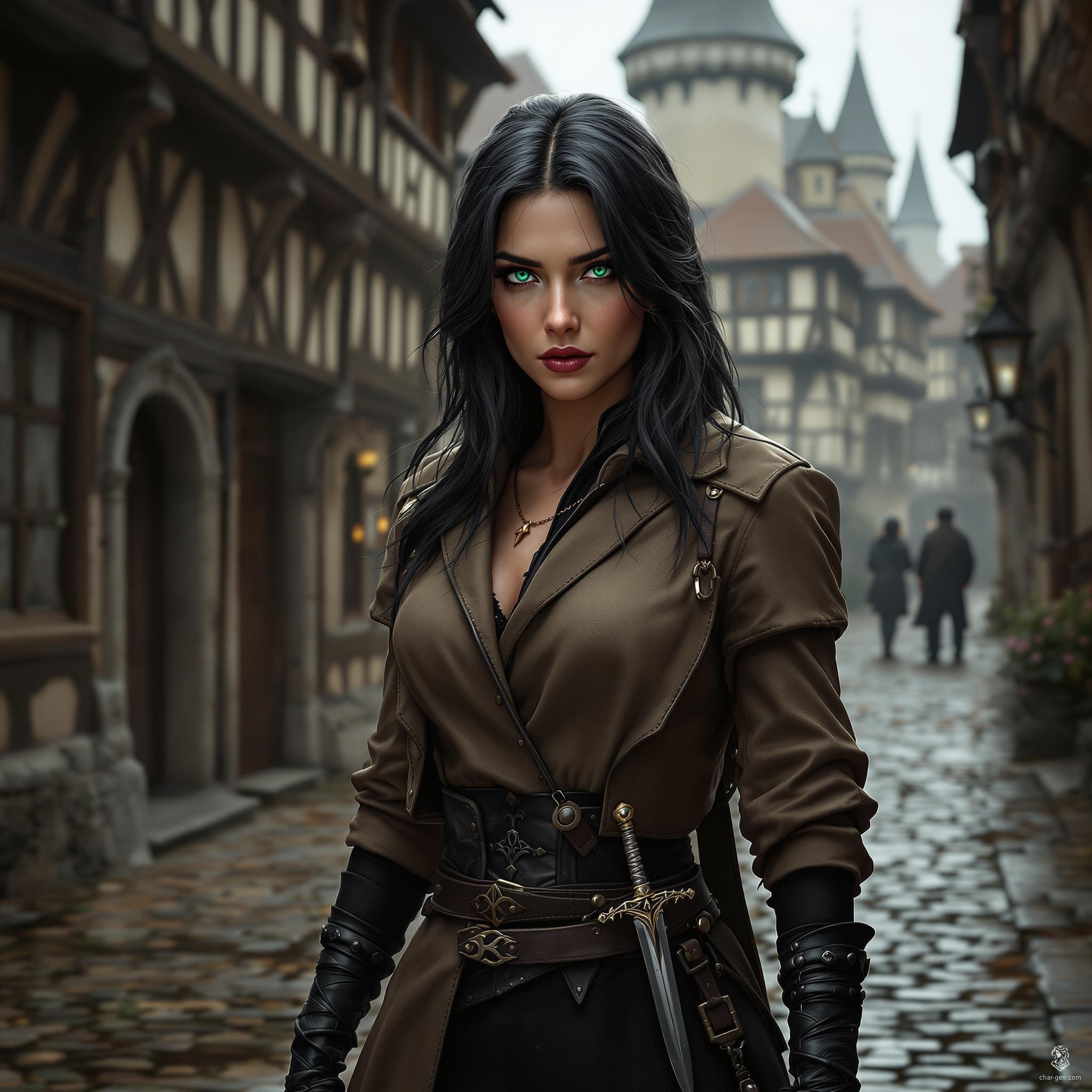 Telva Cornwrath is a captivating spy in her mid-thirties, embodying both allure and enigma. With fair skin and raven-black hair, her striking emerald eyes betray little. Clad in practical yet elegant attire, she effortlessly blends into crowds while skillfully eavesdropping and carrying secret messages, always ready for danger.