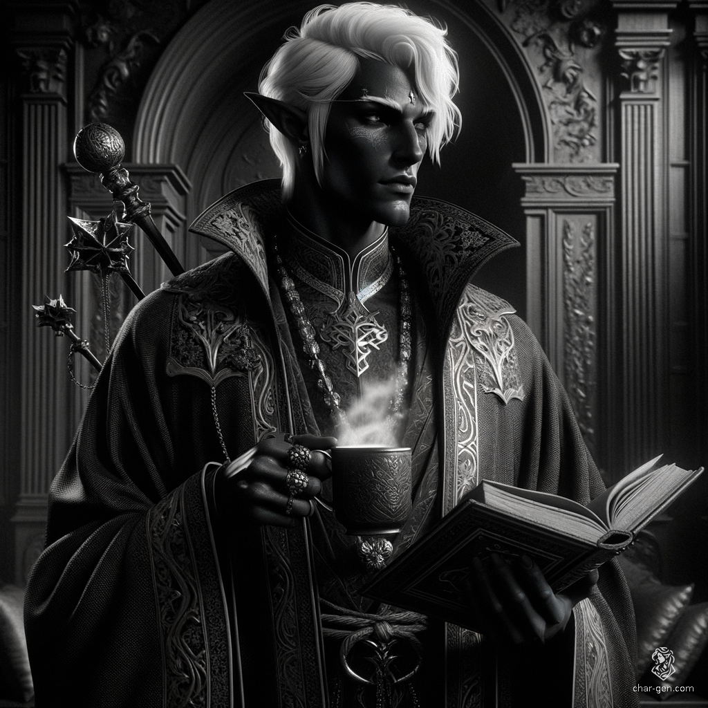 A very dark-skinned male half-drow with bright white hair, intricately curled, sits elegantly in arcane sigil-embroidered robes, sipping hot chocolate. This wizard, clutching an enchanted tome or staff, embodies a striking contrast between his dark skin and luminescent hair.