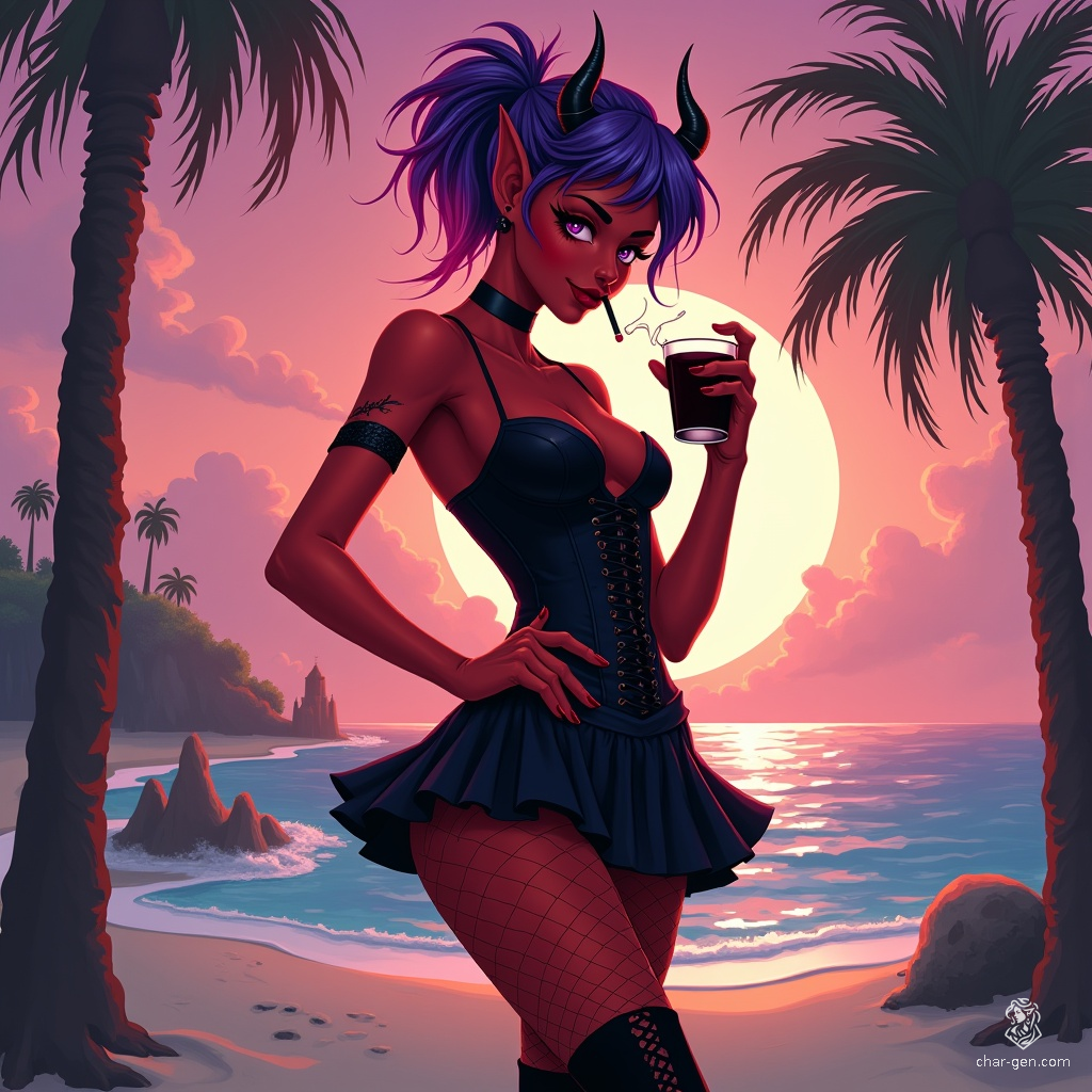A vivacious young tiefling flaunts her striking red skin and devilish horns as she dances at a nightclub. Her vivid violet and blue mohawk glows softly, complementing her edgy goth attire. With a mischievous grin, a cigarette in one hand and a dark drink in the other, she exudes an irresistible charm.