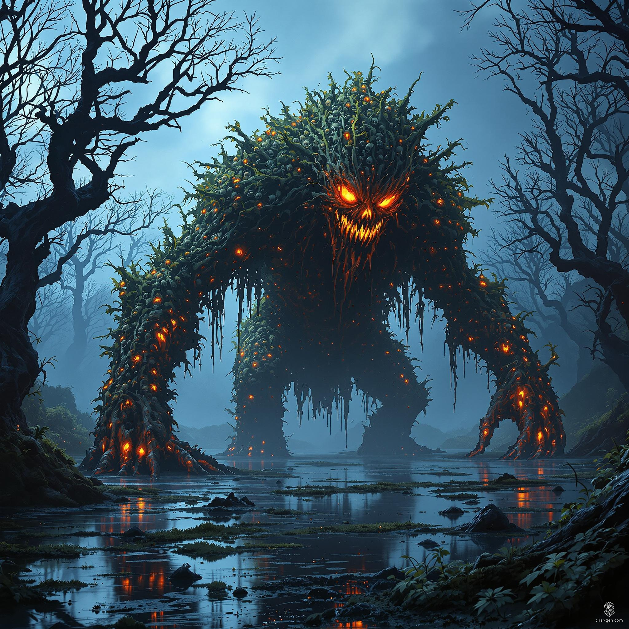 Emerging from the depths of the murky swamp, this shambling mound of moss and twisted roots drips with stagnant water. Infused with fragments of human skulls, it exudes a chilling aura, a grotesque animated heap of vegetation that embodies death itself.