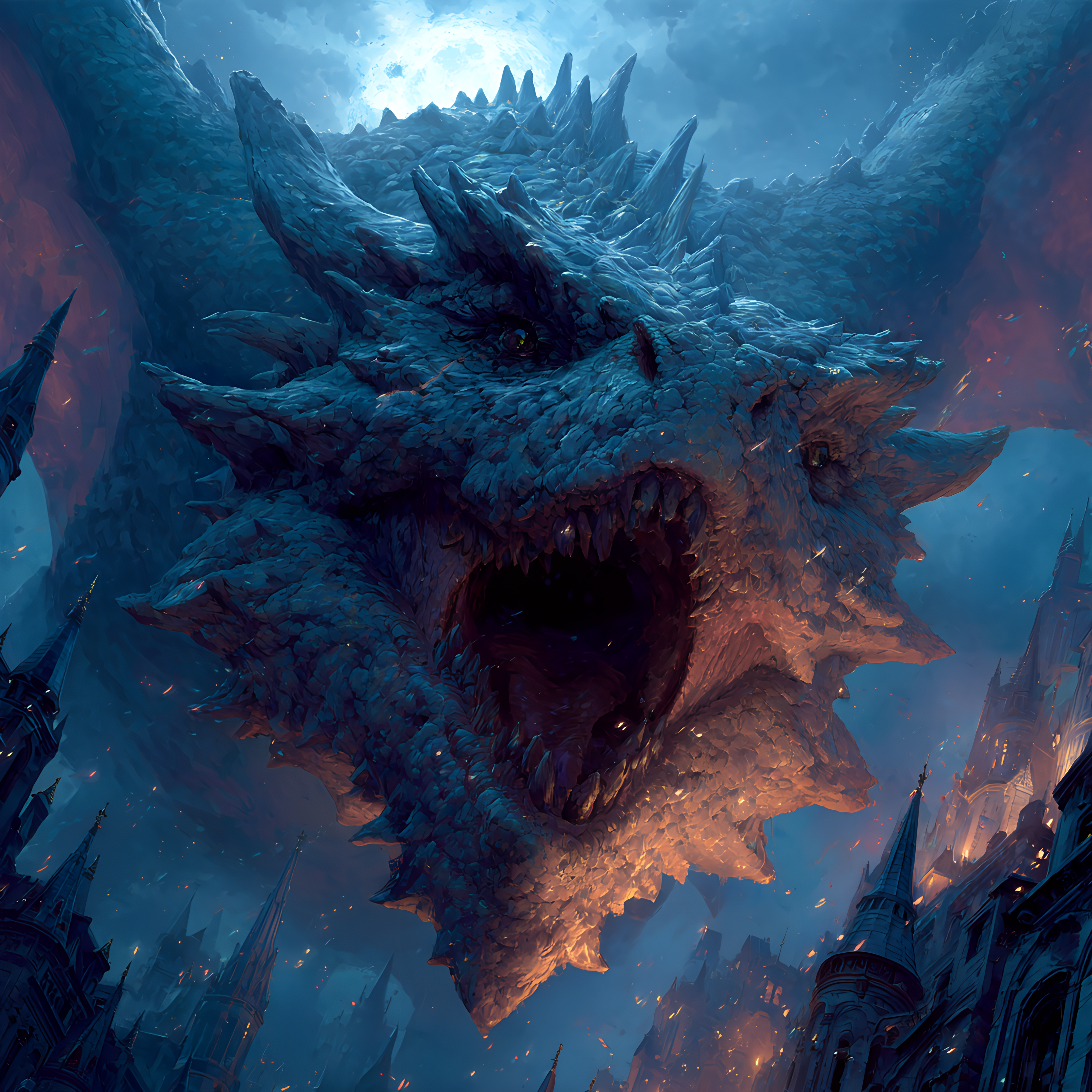 oil-painted epic fantasy, ancient silver dragon overlord mid-roar unfurling titanic wings, shattered citadel spires and spiraling storm vortex, blizzard gales whipping banners and debris, moon-slashed backlight with blazing rim highlights and volumetric rays, triumphant and terrifying, glacial blues contrasted with molten gold and ember orange, ultra-detailed scales and frost-limned horns, razor focus with drifting snow and ember motes, museum-grade canvas texture, cinematic composition, --stylize 650 --chaos 22 --v 7