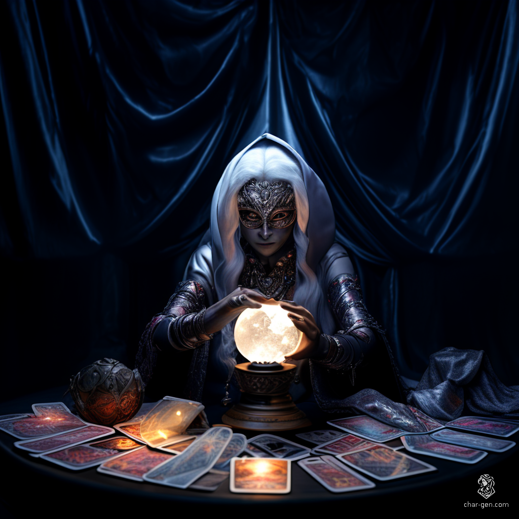 In a dimly lit tent, an ancient drow crone leans over a glowing crystal ball, her bright white hair contrasting with her dark, wrinkled skin. Draped in flamboyant garments, she feigns wisdom, spinning tales and selling dubious remedies to naive seekers, her tarot cards scattered like secrets around her.