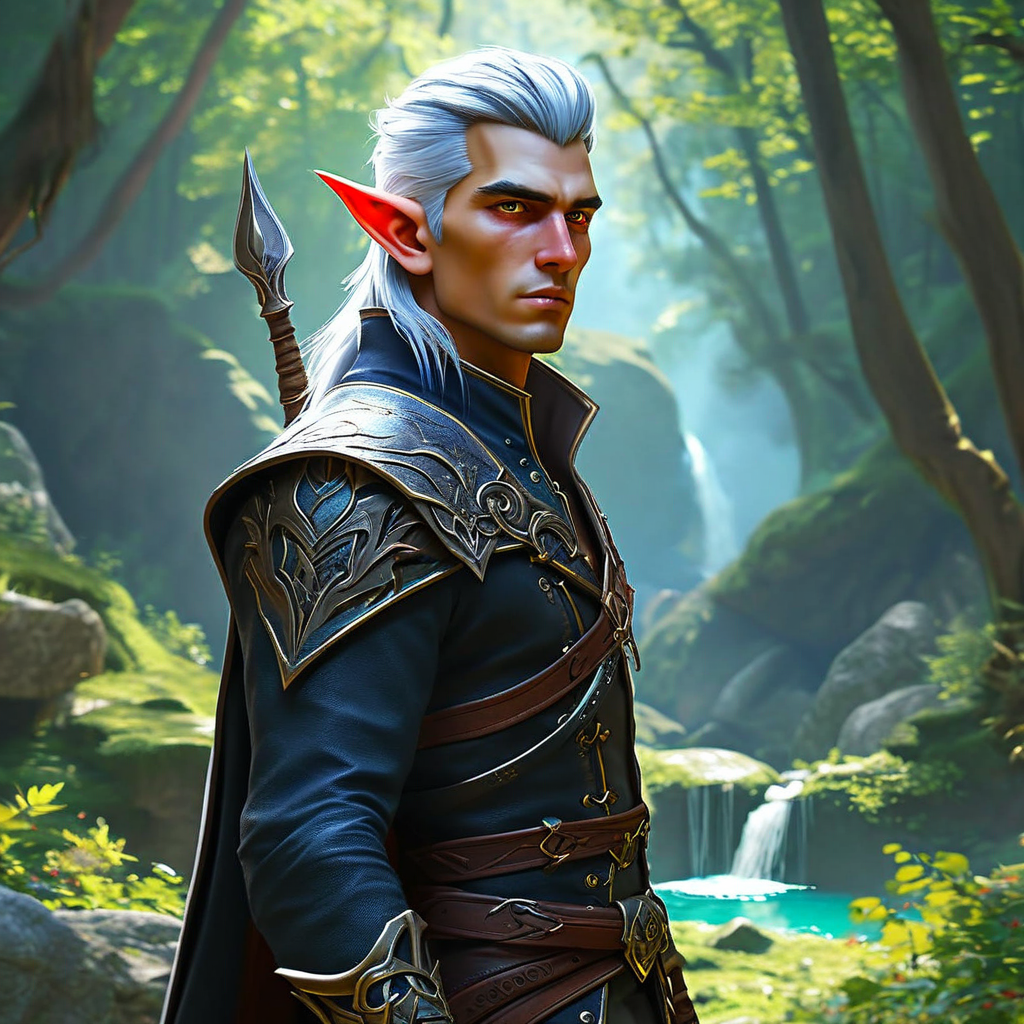 Kaelen, a formidable greying warlock of elven descent, exudes an aura of ancient power. His silver-white hair and arcane sigils etched on his dark leather coat hint at countless battles fought. With piercing violet eyes and a longsword pulsating with magic, he stands as both a guardian and a danger.