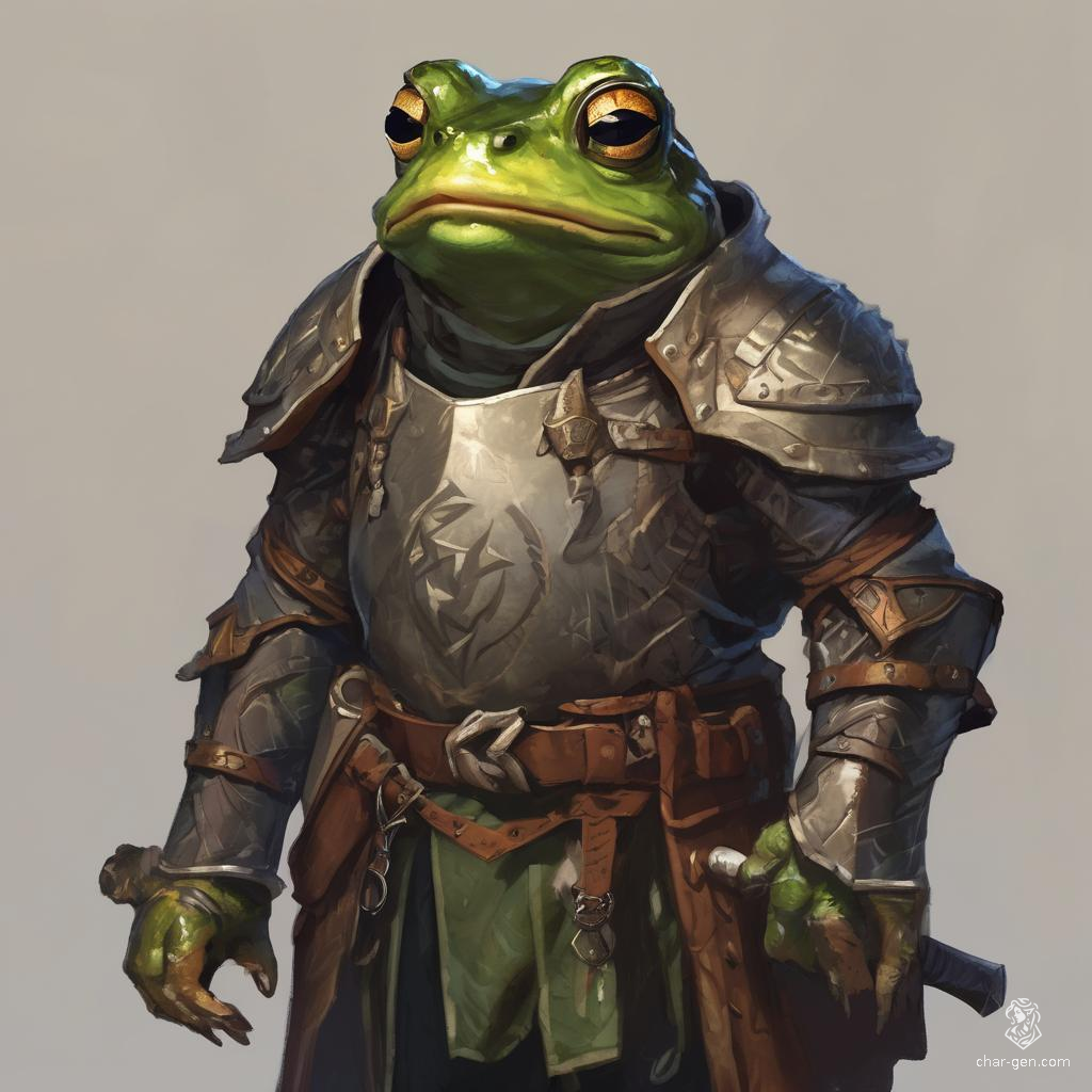 Meet Arlo, a friendly male Grung paladin donning leather armor that blends with his vibrant green skin. Tall and thin, his frog-like features radiate charm and loyalty as he hops into action, dedicated to protecting the innocent and championing the causes of justice in his swampy realm.