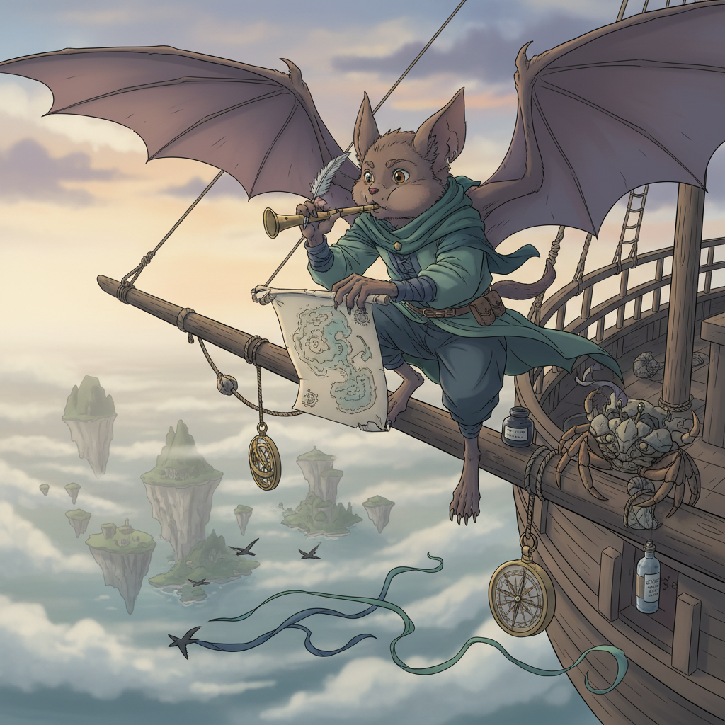 Hadozee bard-cartographer, perched on a swaying skyship yardarm with gliding membranes half-spread, piping a tin whistle while sketching a living coastline onto parchment pinned by seashells, fog-draped archipelago below with trained storm-petrels carrying ribbon markers, a brass astrolabe and wax-sealed compass swinging, salt spray and an inkpot steadied by a helpful crab, cool dawn rim light through sea mist, mood curious, windswept, quietly triumphant, palette seafoam green, slate blue, tarnished brass, parchment cream, anime cel-shaded with clean linework and soft gradients