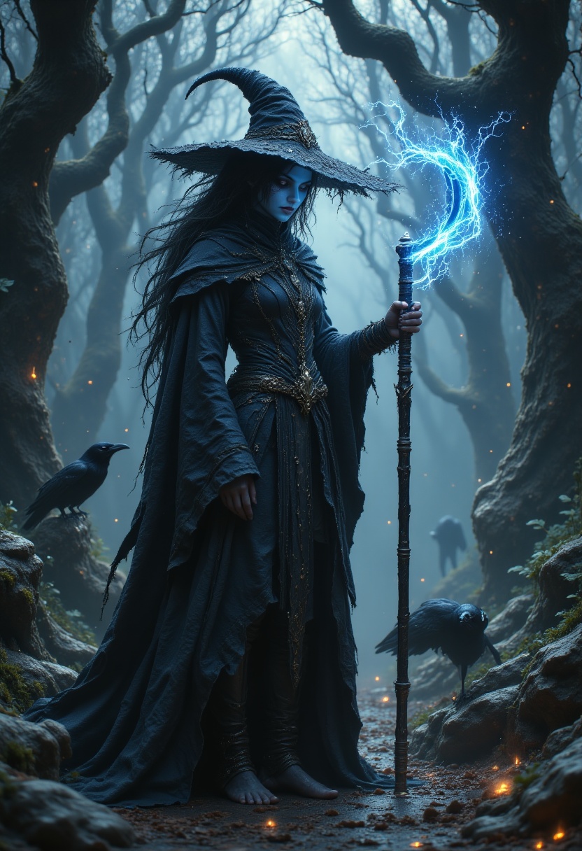 Branwen Umbra, a 230-year-old transformed human, appears as a slender, youthful sorcerer-cleric with shimmering alabaster skin, swirling silver-black pupilless eyes, and writhing onyx hair. Clad in ornate black robes and a wizard’s hat, she wields a scythe and commands ravens, embodying ancient arcane and divine power.