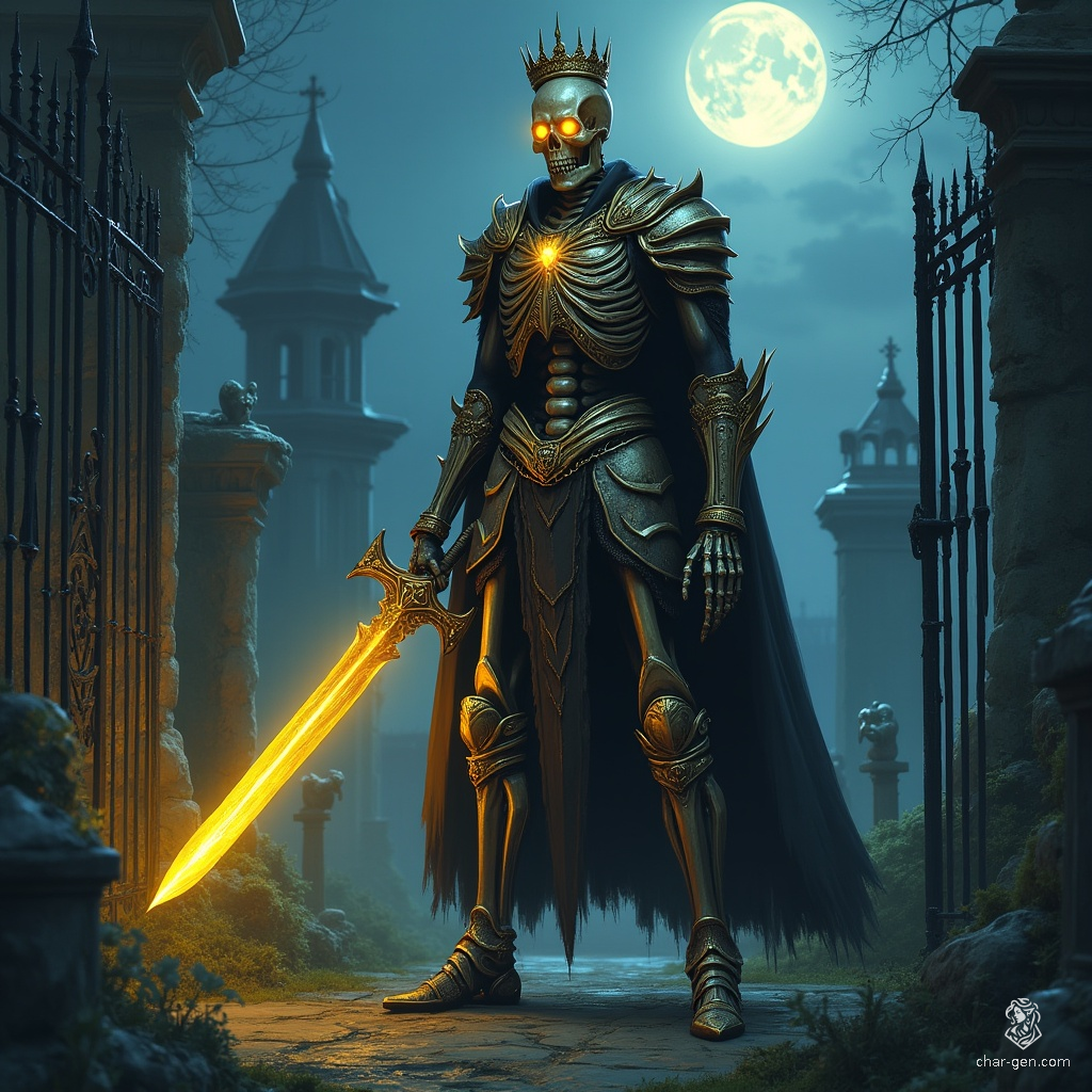 An animated skeleton warrior clad in dark gold cuirass armor and boots, crowned with a golden crown. Its sparkling yellow eyes blaze beneath the moonlight, wielding a bright yellow glowing two-handed broadsword. Set in a dark cemetery, the cinematic scene glows with dim blue light and sharp shadows.