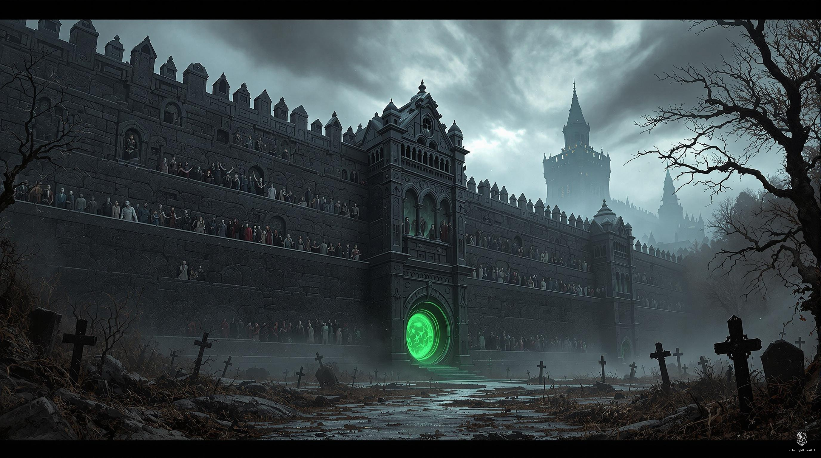 The Wall of Forgetting is an enigmatic gothic monolith, stretching into eternity under a foreboding sky. Its high-relief carvings capture diverse figures trapped in startled eternity, a moment before passage. A sickly green portal throbs ominously, seeping dread, and casting shadows of forgotten sorrow across the crumbling landscape.
