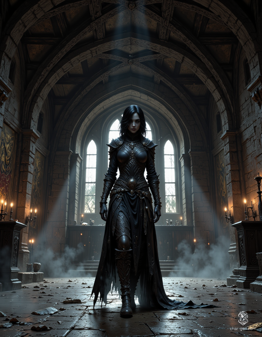 In the depths of a shadowy castle, a young female assassin glides effortlessly through the night. Her jet-black bob frames a pale face, accentuated by form-fitting leather armor that highlights her curvy figure. With daggers hidden expertly on her person, she embodies both beauty and danger.