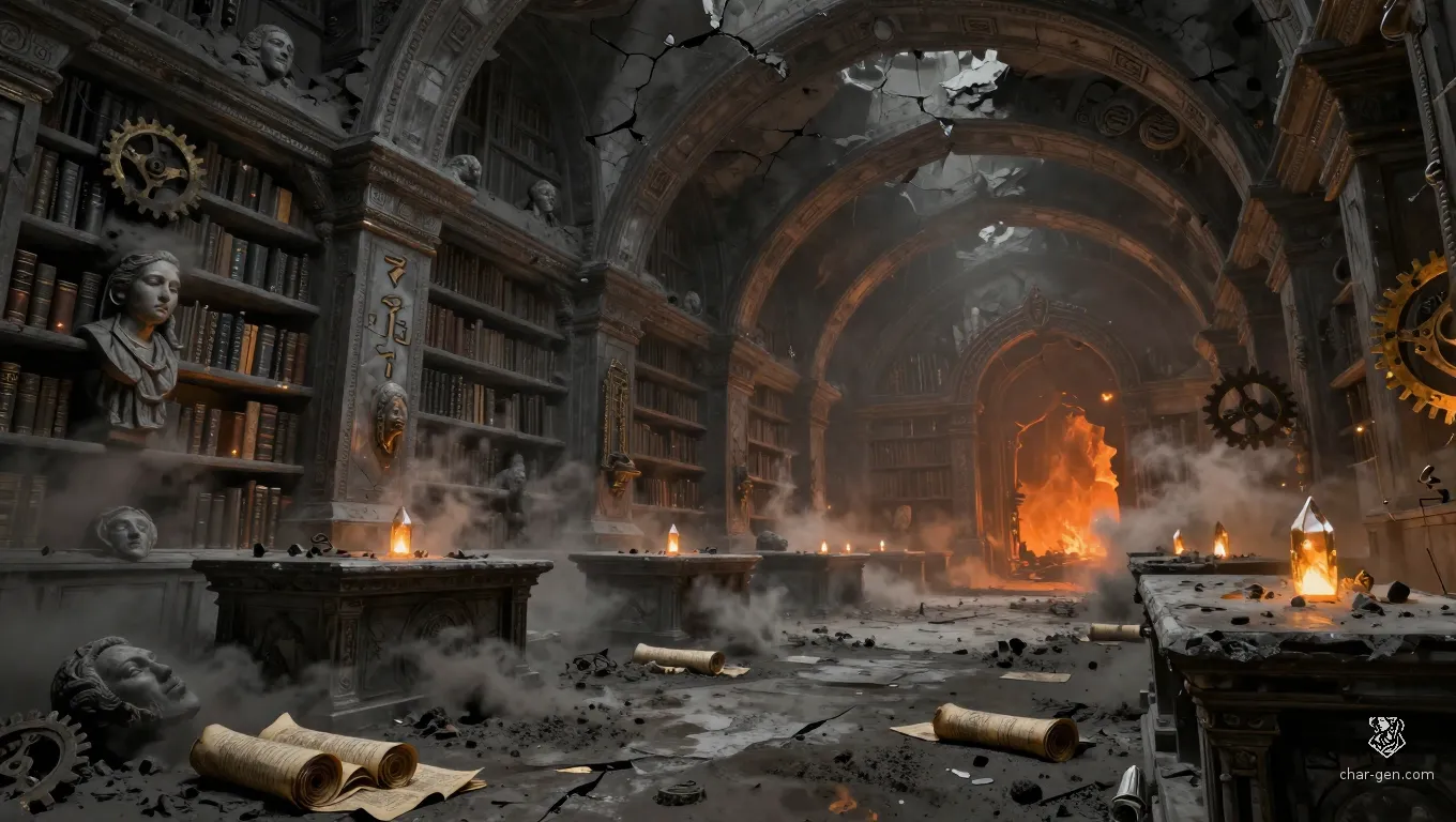 A slanted temple of learning partially swallowed by the ash-fields of the Outskirts. Grey silt spills through cracked ceilings, and the air is heavy with the smell of scorched parchment and ancient ozone.