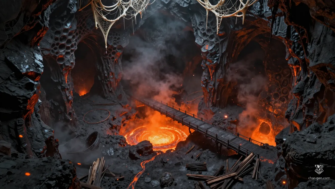 A network of vertical shafts and heat-warped tunnels carved into the glass-like obsidian of the Black Mesa. Magma trickles through cracks in the floor, illuminating the charred remains of those who dared cross the trade routes above.