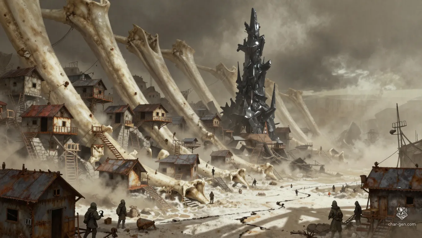 Low-Point is built directly into the lee of a giant petrified ribcage that curves hundreds of feet above the basin floor. The 'town' is a vertical sprawl of scrap-iron shanties and stone huts bolted to the bone. At its center stands the Air-Filtering Spire, a monolithic tower that supposedly cleans the salt from the air. The settlement exists only because of this spire; without it, the alkaline dust would kill a person in hours.